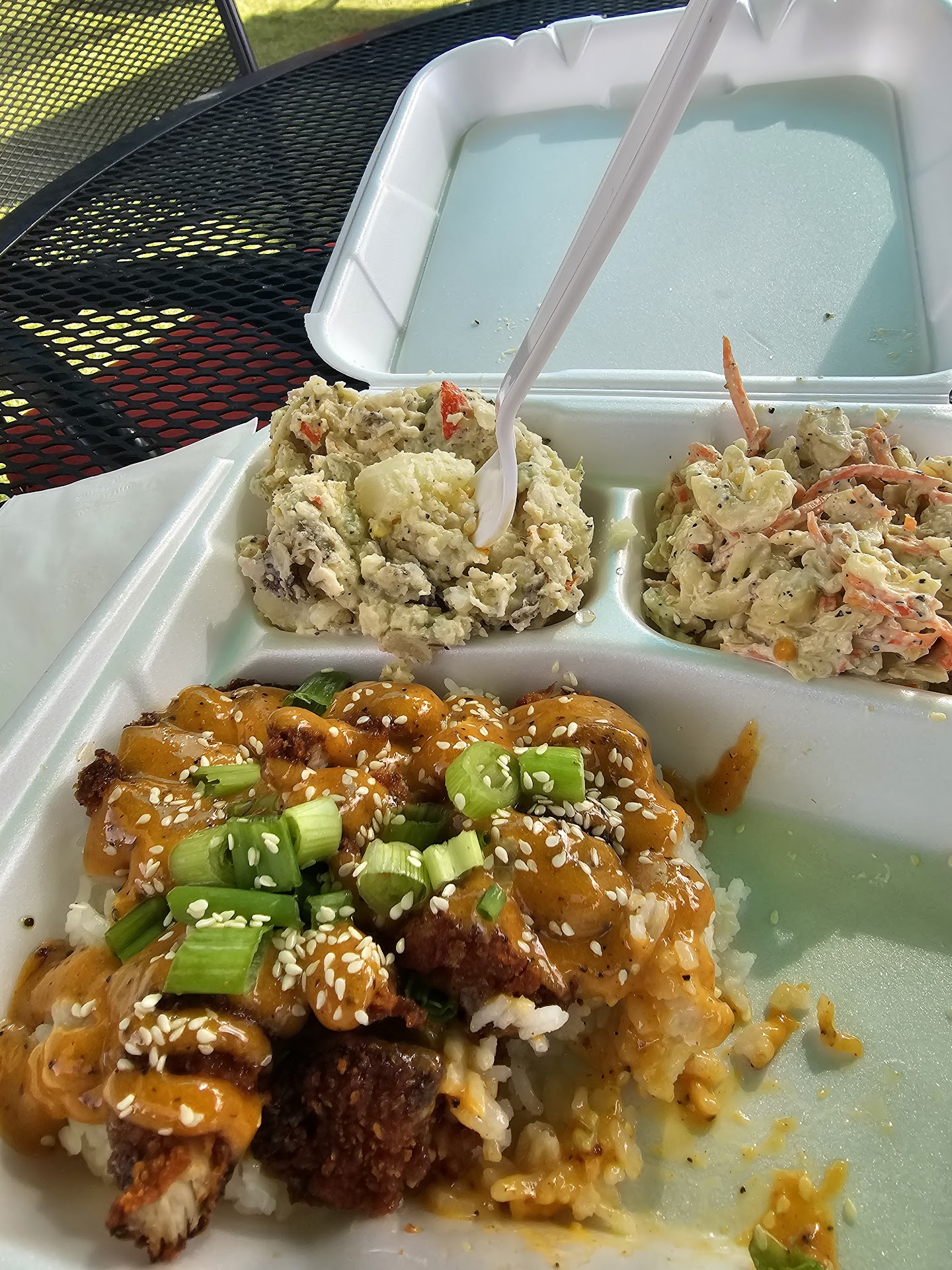 Read moreThe Mochiko chicken was really good. The sauce had notes of both sweet and subtle heat. The rice was seasoned in the same fashion as Polynesian rice, which was very slightly sweet. The meal had a generous portion of sauce drizzled over it, which made for an exceptional treat! The crab potato salad had a good texture, which for me means that it was NOT seasoned mashed potatoes. The dish has artificial crab meat, but if they used real crab meat it wouldn't be priced reasonably under $4.00. I'm also a big fan of Hawaiian food, particularly the staples on the plate. Macaroni salad is a standard and theirs was quite tasty. The only thing better was the customer service and atmosphere. Very family friendly, and entertaining on this warm and early summer evening. Definitely worth a visit. My honest review is that Moscow, Idaho is coming up with their "foodie scene" for a small rural community. Nice people, relaxed atmosphere and...