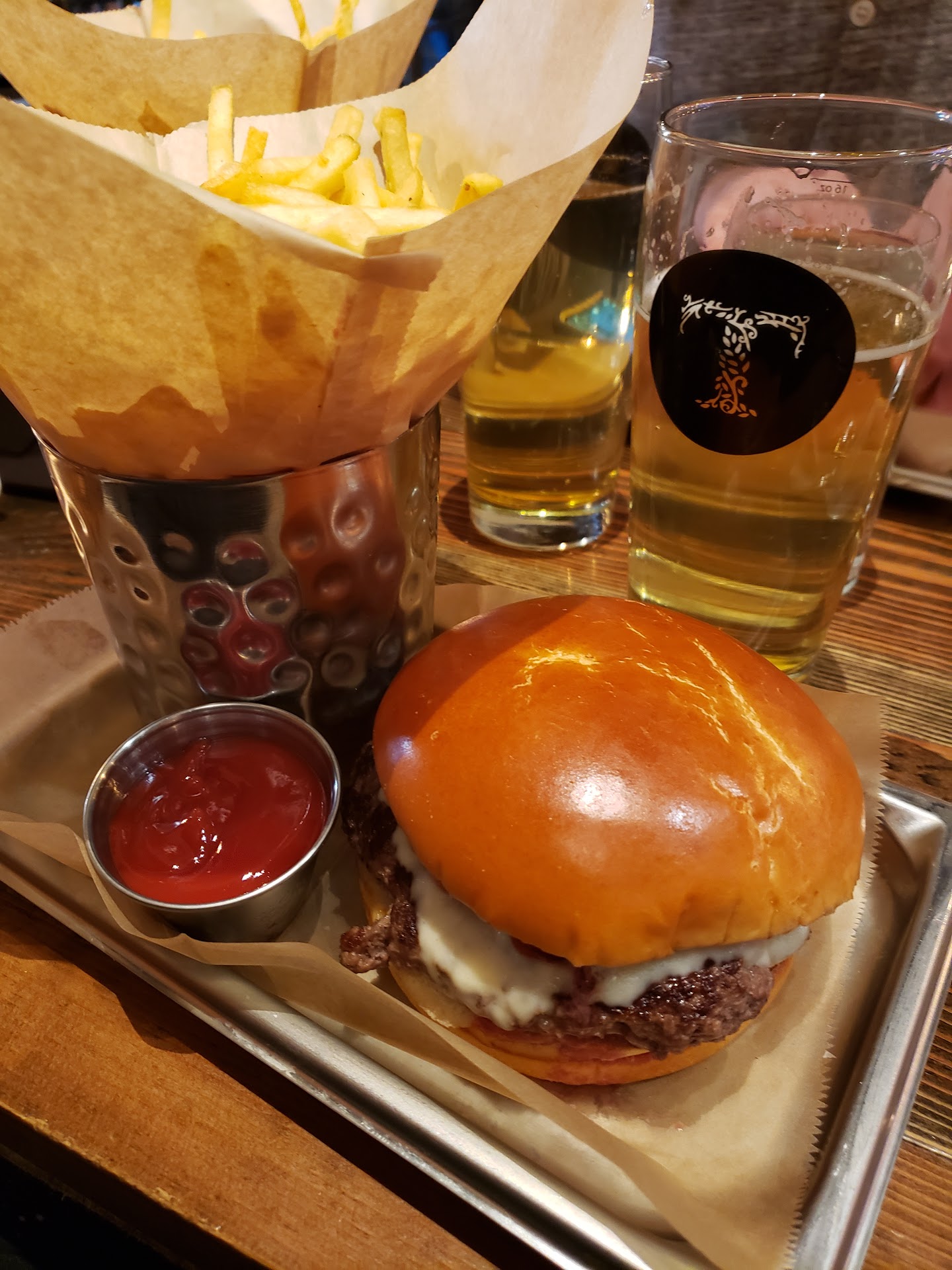Second: Not a great experience. We arrived around 9 pm, me and 4 friends which none of us had attended before. Waitress first asks us if we want food and drinks or just drinks. We respond both, she corrects us that they are only serving appetizers at this hour (Why not lead with that?). I order fries, she responds they are only serving non fried items from the menu (Which is like half of the appetizer menu, maybe less). Eventually after all of us wanting fried items she says they will make them if we order immediately (What bar closes the fryer long before closing?).