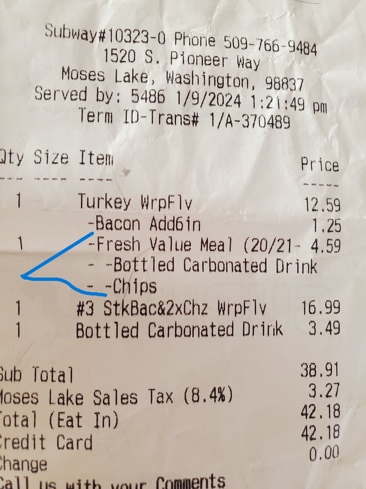 Read moreWhat a disappointment this facility is. We stopped in primarily because we can USUALLY order the Foot Long as a wrap and save some carbs. The so-called Sandwich Artist behind the counter laid out the wrap and the meat, not even amounting to 4 oz...This shall be a 33% meat increase, as advertised for the Titan Turkey? What B.S.!!! , Upon challenging the meat portion, an employee held up two measly containers of shredded something to "prove" how wrong we were. We were then over charged, the idiotic employee asking for nearly $44! After further revisions and screw ups on the ticket, which reduced the incorrect charges only $3, we gave up and paid the criminal payment demand. You can see the receipt and how they charged us incorrectly. How does 2 tiny wraps, nearly devoid of meat ($11.79), two extra meat charges ($3), and two bottles of soda ($?) come to $41.98??? When I stated that we had much bigger wraps at two other locations (Eatonville, WA and Firestone, CO), the brilliant sandwich artist replied with "Oh, you are a long ways from home." This is yet another example of very poor customer service, typical of everywhere you spend your hard earned dollars. Worst Subway experience, EVER. Thanks a lot 1520 S. Pioneer Way employees and manager. ...