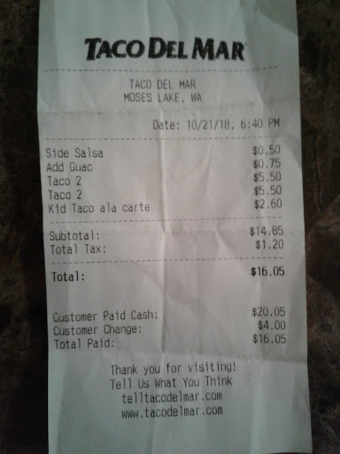 If you're in Moses Lake and craving some delicious Mexican cuisine, Taco Del Mar is an absolute must-visit. I can't recommend it enough for its great food, friendly service, and impeccable cleanliness.