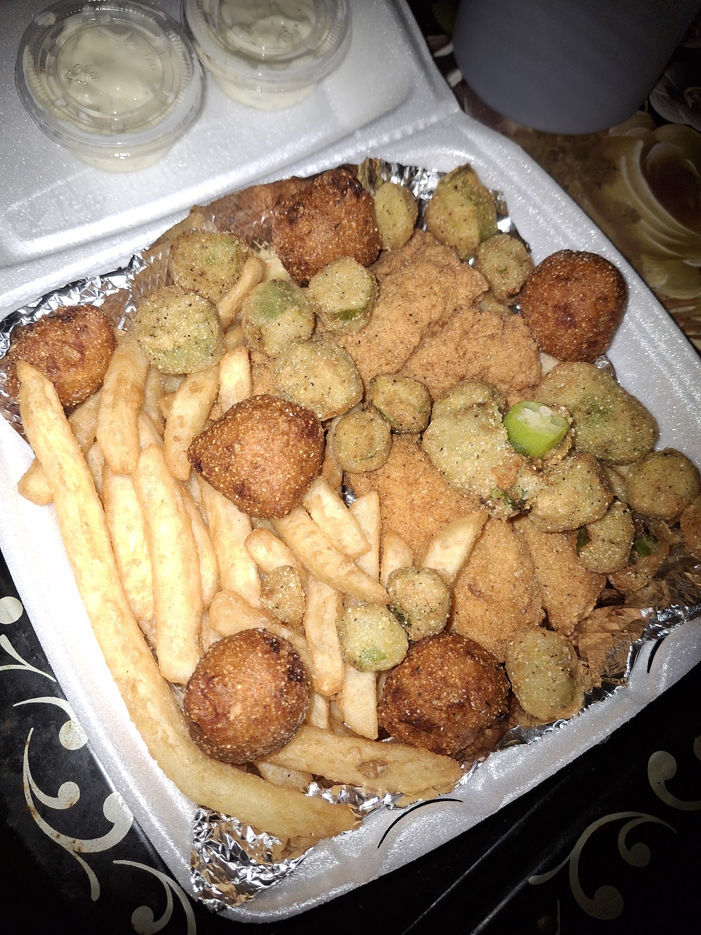 Where to begin? I ordered the catfish filet special add okre. My order came with 2 large plump filets, a generous portion of fries, okre, and several hush puppies. The fish was seasoned and fried to perfection. I'm funny about my fish! Call me the goldilocks of fish! I want it crispy on the outside but tender on the inside. I want it seasoned but not overseasoned. I also want it hot and not greasy. BA-BAY! When I tell you, that's EXACTLY what I got!! Whoo! I got my order and drove, drove home, and walked my dog before ever opening my plate. Food was STILL HOT and CRISPY....even the fries! The hushpuppies have a nice kick. The fish is not overbreaded. The okre is lightly coated as well. Everything was seasoned well! The front staff was cleaning the entire time. The young cook presented my plate, making sure to open it and show me. He wanted to make sure it looked pleasing to me! THAT is customer service, and he did it with a beautiful smile!! They even have cakes and pralines you can purchase. They are made by I Am Candy & Things. I will definitely be back! You...