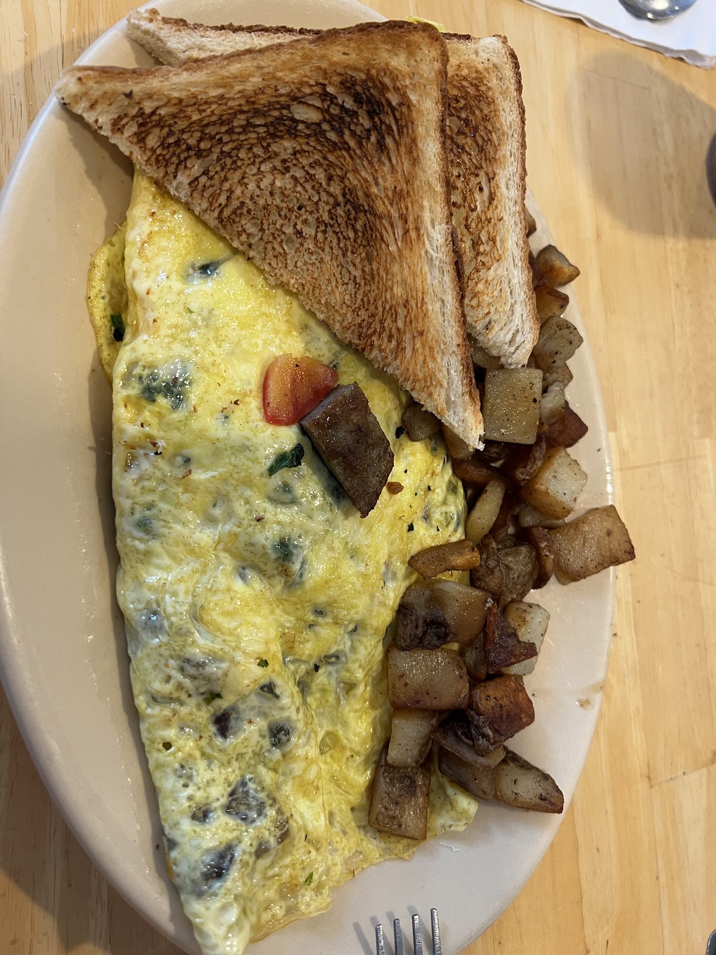 Read moreCash only -.5* Large ,unpaved parking lot Nice clean look outside Handicap friendly + Inside very nice wood decor Table or bar seating is ample Food: Coffee I had was good but I never got my refill Omelet was cooked well and stuffed full of ingredients. Home fries with or without onions very well cooked Biscuits and gravy done right! Tasty gravy and fresh biscuits plus eggs on side done perfectly! Bread was raisin and nothing special but hot and fresh Bacon not greasy and done right! Prices very reasonable A definite place to try Only -.5 star for cash only policy but have atm on premise So 4.5* definitely a place to try! Would be 5* if took cards! Amendment! Now 5âď¸ food is always perfect and greeted by name all time (even though I go a lot of different breakfast places so not here that often) so even though cash only, still gotta give perfect score for perfect...
