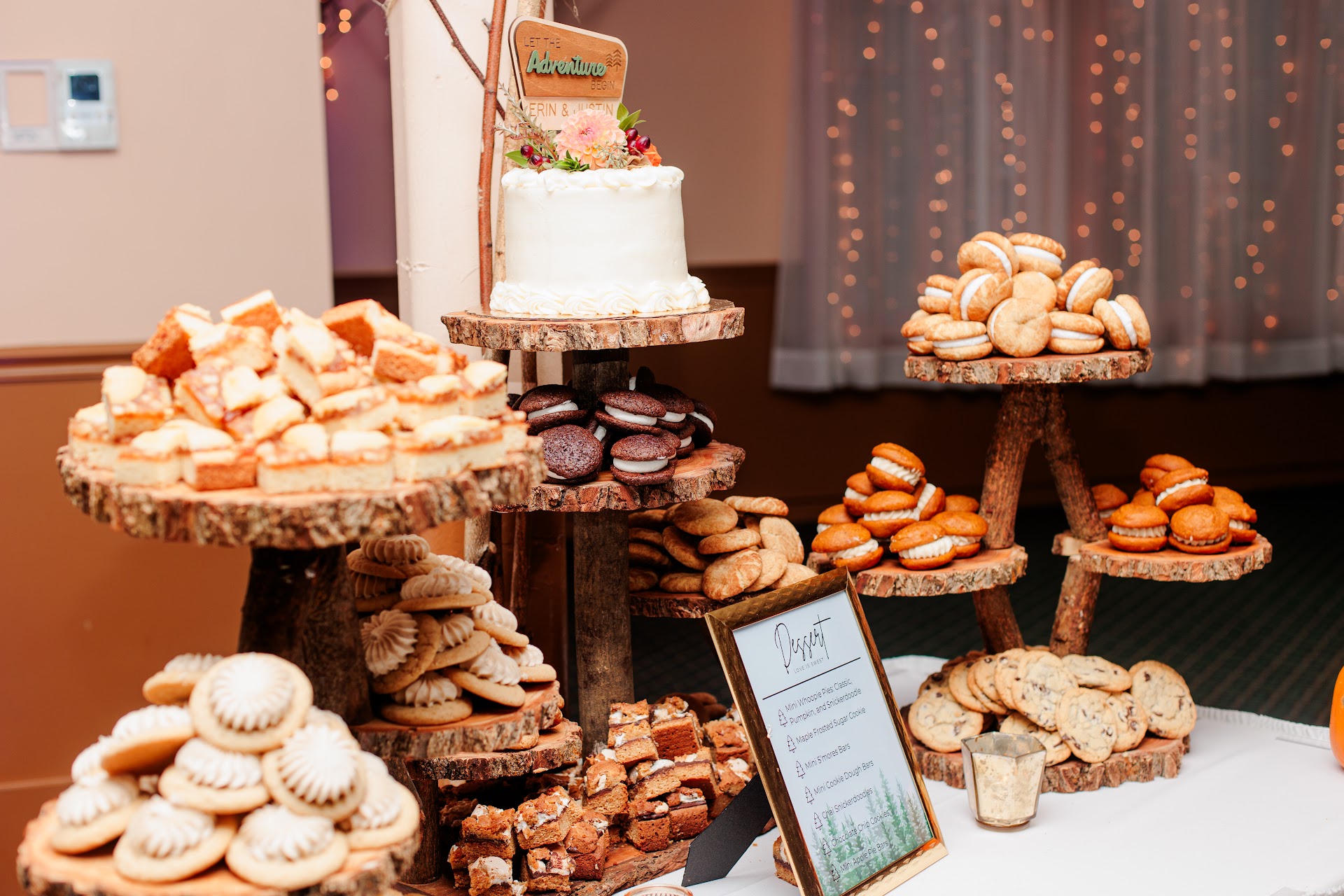 We opted for a small cutting cake and a variety of desserts including mini pumpkin whoopie pies, regular mini whoopie pies, cookie dough bars, s'mores bars, apple pie bars, and chocolate chip cookies. Every bite was a delight, and our guests couldn't stop raving about how delicious everything was.