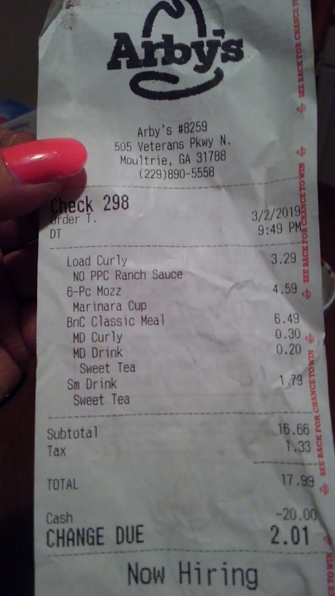 I called yesterday afternoon to place an order. A lady named Crystal answered. She was very pleasant and friendly and efficient. She took my order, repeated it back to me, and said it could be ready in as little as 5 minutes ! I told her that was great, and that my husband was on his way. When he got there everything was ready. It was hot, fresh, and made just as we ordered it. I always call a restaurant the next day, if we have had a good experience, because I know from experience, (37 years in the restaurant industry), that people usually call when it's bad, but not when it's good. When I called this morning, Crystal answered the phone. I began to explain that we had place a pick-up order yesterday and she said "Yes, I remeber you. This is Sherry, right?" She even remembered our order and the special requests we had made ! That is great customer service ! We have lived in Moultrie for 3 1/2 years and this was the absolute best experience we have had with a fast food restaurant, in that entire time. I believe that this Arbys location will be our favorite place...
