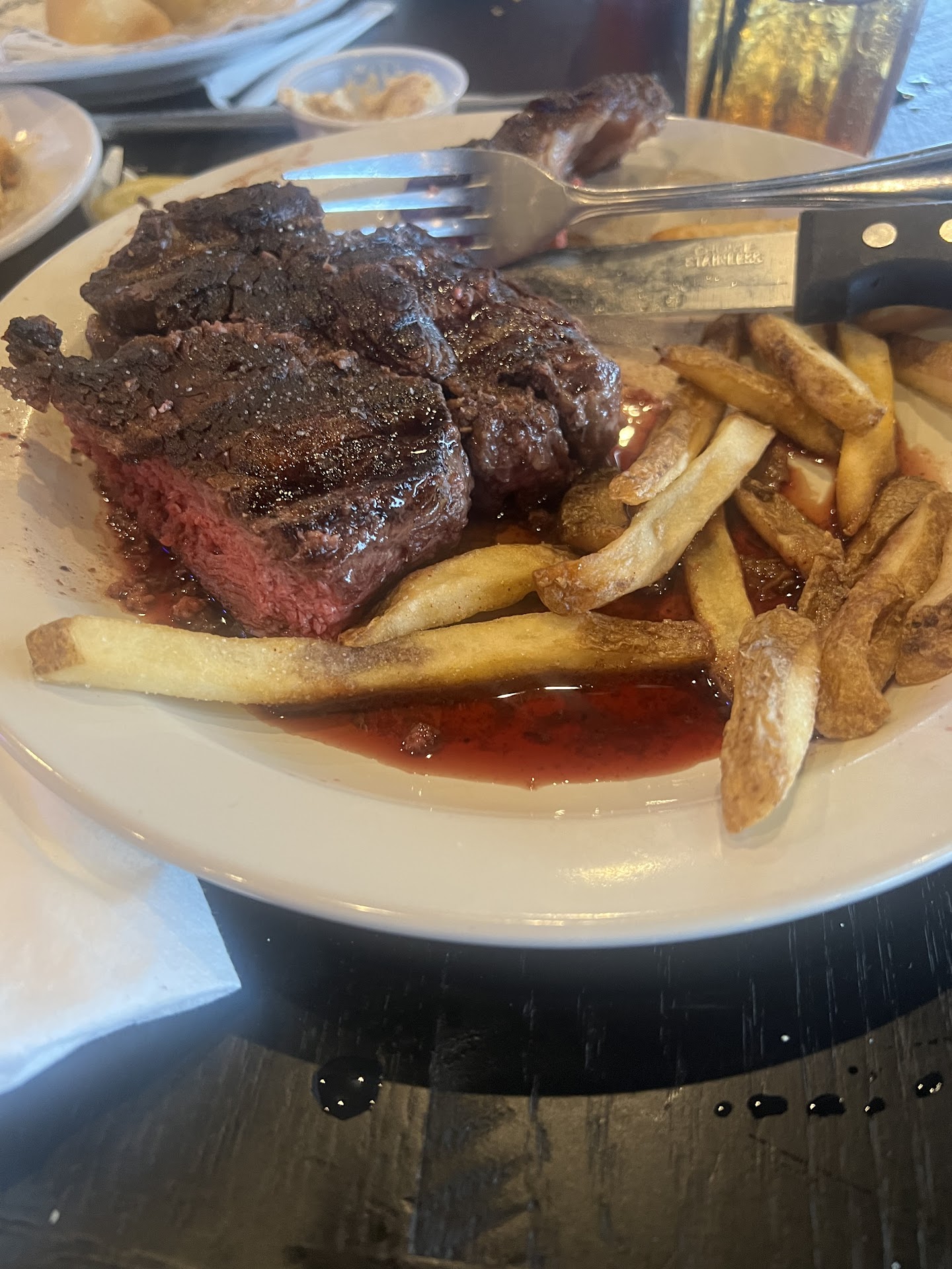 Whomever made the steak simply can’t make steaks. I could not eat the fries because they were so salty and then they were saturated with the fluids coming out of the steak.