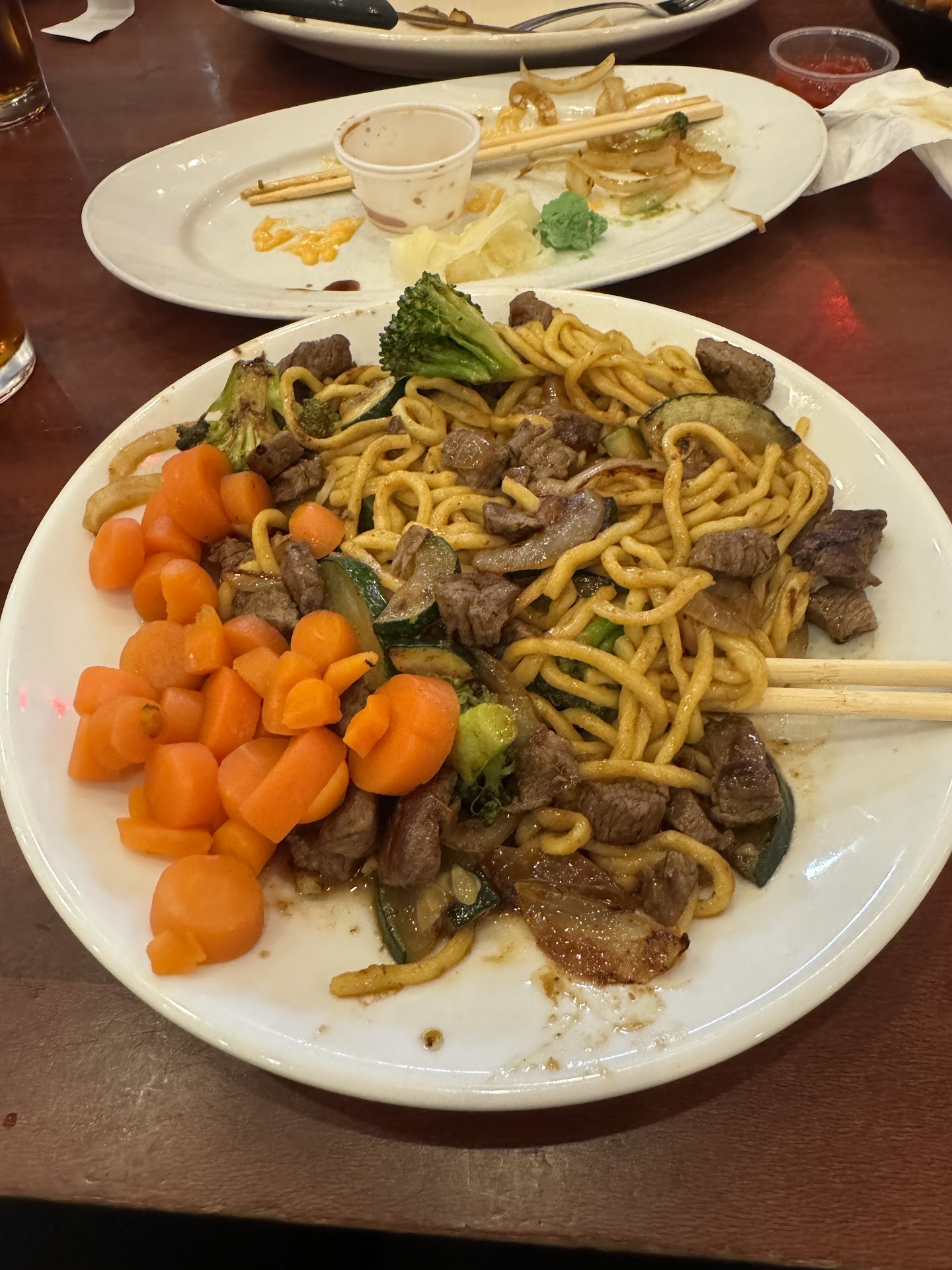 The noodles were atrocious. Overcooked slop, no sauce, the only flavor is black pepper. Half the plate is cooked onions in various stages of cooked. The carrots are microwaved frozen carrots tossed on the plate as an afterthought. The meat was ordered rare and came three stages past well done. I wouldn’t feed that to my dog. They’re using Cantonese noodles, which are fairly hard to overcook but damn they found a way.