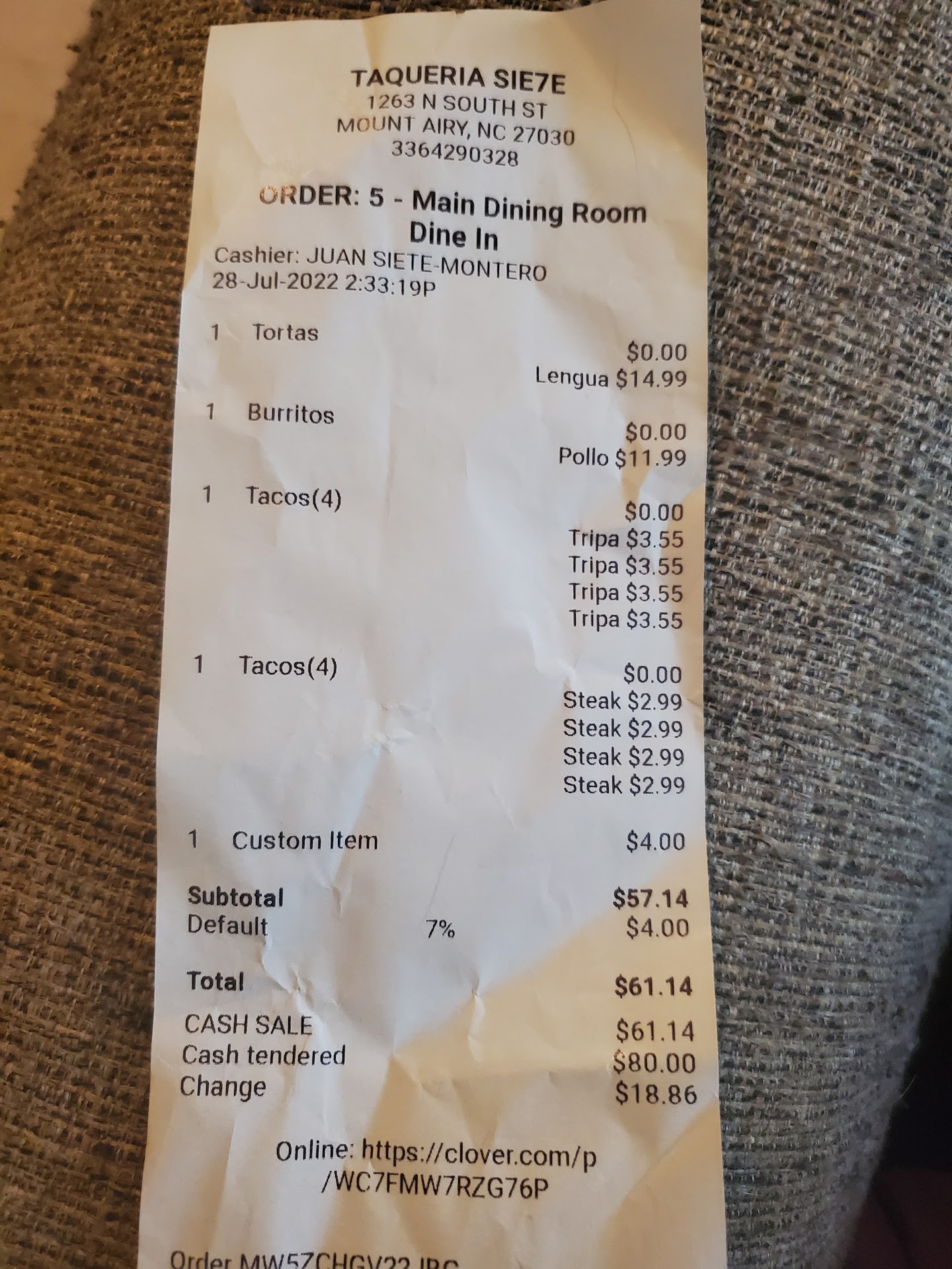 The bad, they really need to update the prices. In the menu it says $6.99 for an order of 4 tacos, and a torta and a borritto. At the bottom of the section it states that price may very by type of meat. After we ordered we didnt expect it to be more then $40. Looking at the receipt they charged us $14.99 for the stake torta , thats more then dubble the listing. For the tacos they charged us $3.55 each taco for one order of 4 and $2.99 for another order of 4. And a chicken burrito for $11.99. All are more then dubble what the price that is listed on the menu. Then we got charged for a custom item and we dont know what that item is. We understand charging a bit more depending on the type of meat but dubble?!?!? I dont think so. We will most likely not...