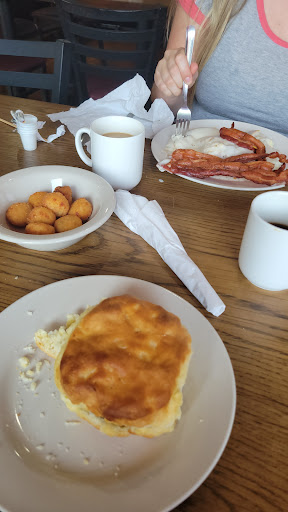 They were a little busy but we didn't have to wait too long for our food.The lady that waited on us was kind .I ordered a large biscuit and gravy side of sausage which is 9.79.My daughter ordered a large biscuit gravy 6.99 with a small cheddar rounds which was like 3.50 I think .When we received our food we weren't given any silverware and my daughter didn't get her cheddar rounds .I had to get up and wait to ask for those .The whole right side portion of my plate was cold I mean cold !!! not just the gravy but the biscuits .There was only a tiny portion on the other side of my plate that was semi warm the rest was cold .I was going to say something but the server never came to the table until the very end when we were done.When we got up to pay our server overcharged us .She charged my daughters meal as a combo the 9.79 price plus the cheddar round charge I ordered the combo one but she didn't get a side so she should've been charged 6.99 instead of 9.79 .I politely said something and she called another worker to fix the register issue. He wasn't the manager but had a very poor attitude when I was explaining the overcharge ,since he had an attitude I went ahead and said that my food was cold .He didn't apologize but instead said why didn't you say something then. I said how could I the server never came to our table until we were finished. He continued with his bad attitude so I said why are the cooks serving cold food I will never go back here .Fine dining prices and you get terrible service and cold...