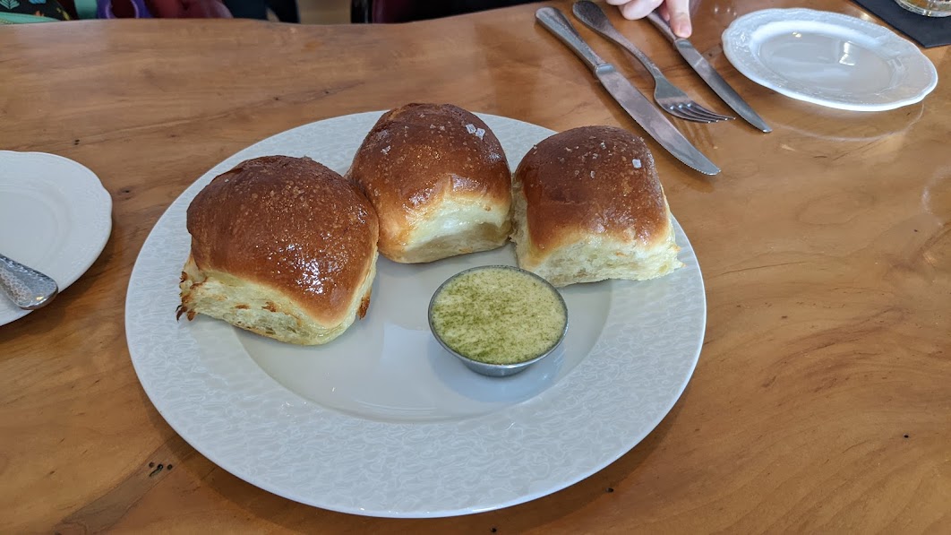 I wanted an app, but I didn't want to get anything too big, so I saw Tiffany's Handmade Yeast Rolls (with Whipped Florida Sugar Cane Butter & Maldon Sea Salt), and knew it was the app for me. Oh so soft. A fluffy roll, fluffier than a Hawaiian, for that really zingy butter. Sweet and salty at the same time. A really impressive app.
