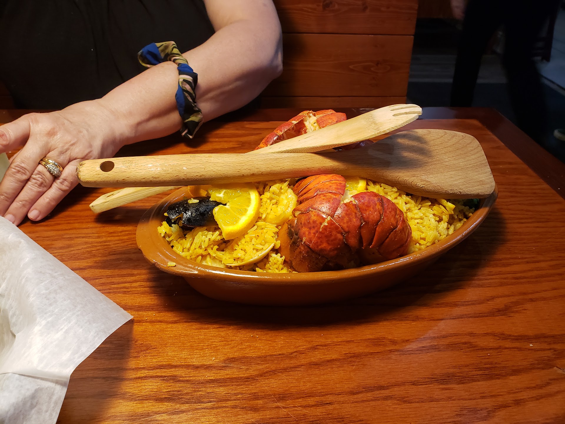 My 12 year old son liked the novelty of the red snapper. The paella was overcooked & very mushy, unseasoned, not at all flavorfull. The lobster tail I had was so overcooked & rubbery & curled up it could have been mistaken for a jumbo shrimp. The "house sauce" that my seafood was drown in was a tomato based sauce with no flavor. Chef Boyardee has more flavor than that red sauce & it would have been less gritty. Everything just fell very flat.
