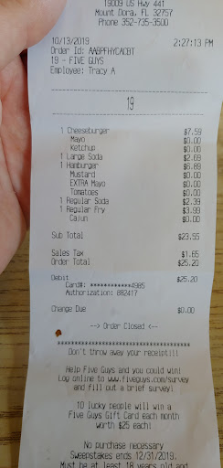 Used to be great...when it was new. If I could post less than one star I would as you can probably get better service at McDonalds across the street. They have been restaffed about 3 times now. The food is pretty hard to screw up, but I am disgusted with the current service as of April 2019. The girl behind the counter making fries either can't count or just doesn't care- she makes batches of pre made fries one order at a time and cant be bothered to properly make cajun fries.... We have waited 20+ minutes on numerous occasions for food that should take 5 minutes (and then watch other people be served hot dogs....? I get it they are pre made but you SKIPPED my order to cook others...) there is a number system in place for a reason. Besides this when I tried to get them to make my food in numerical order last time I was they were all strangely calling me a dumb cracker and told me to make my own food. NO that is why YOUR EMPLOYEES get paid Five Guys. If they cannot get proper staff they should close the location. Love Five Guys in Orlando, as I lived over there for 10 years and have moved home. This Mt. Dora location is a JOKE. Horrible employees, will gladly support local businesses over this sad excuse for a Five Guys. End the lease and let someone else open something of actual use- because besides everything else the place is generally empty. Just HORRIBLE. Don't want anyone to think this place has anything to do with the City of Mt Dora. Thanks...