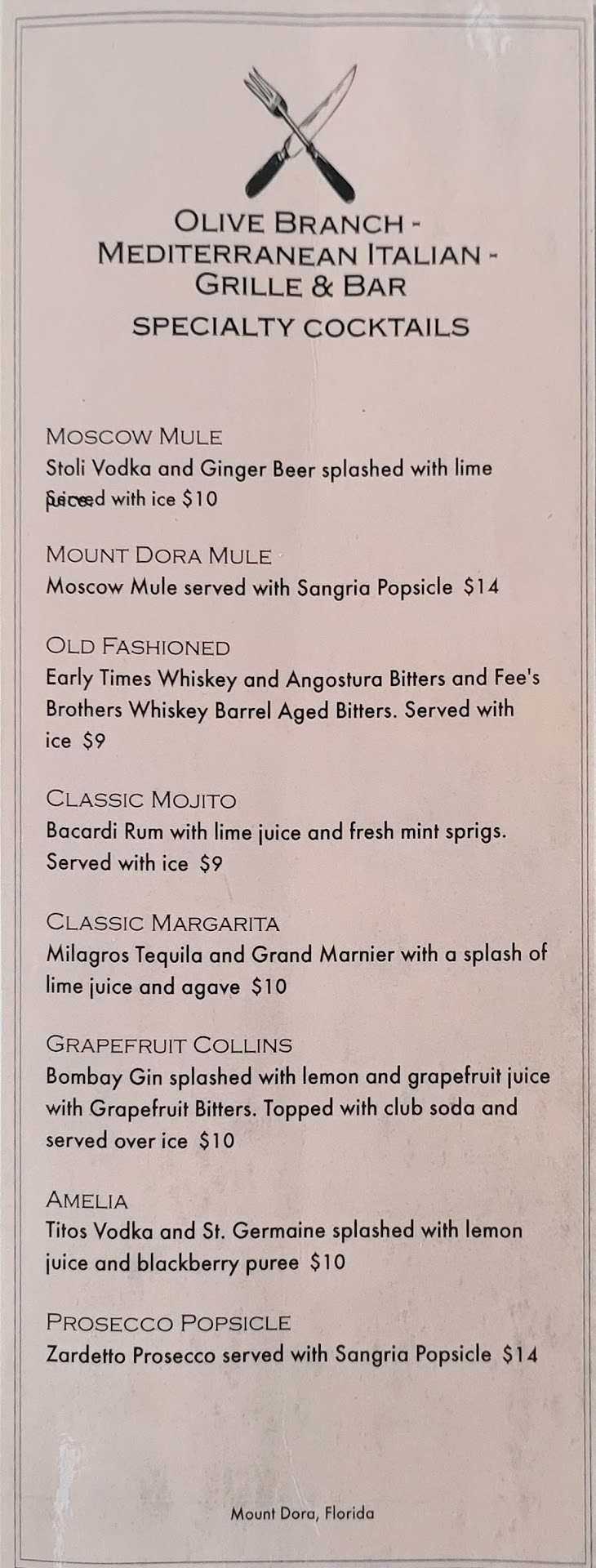 Read moreMy friends and I have been planning a holiday dinner together for weeks now. We all were coming from different parts of Florida and landed on the beautiful Mt Dora. We planned to get everyone together along with our spouses and a new baby. It is my sonâs first Christmas and first restaurant dinner. We made a reservation for 5:30pm for 8 of us. Despite the reservation being made, the restaurant sat us at a table that was blocking the entryway to the right of their restaurant indoor entrance where I sat with my infant baby and had to get up from sitting every time a server walked by with a tray. It was a beautiful but slightly chilly December evening but electric warmers surrounded the outside patio however, we happened to be seated by the one warmer that was not working. My friend asked if it could be turned on to which the older white male staff member responded to her with a rude, âif youâre cold, you shouldâve sat insideâ and never turned it on for us. We then asked to move to the table right next to us (outside patio). Half of the outdoor tables were open. Despite the three staff members we asked, no one said yes and no one said no, but we were tired of being in the way of the servers as Iâm sure they were tired of it as well. So we moved over. No staff member helped us. As a matter of fact they scorned at us. We ordered our food, which took almost exactly two and a half hours to receive. Our meals didnât come out until 8:05pm. 6/8 of us didnât receive the meals we ordered AND the food was served cold. We were so hungry at that point, many of us force-fed ourselves what was served in an effort to get on with our evening. When I asked to speak with a manager after our less than satisfactory meals, the woman I kindly asked (for a manager to speak with) said sheâd be right back and then just never came back. After waiting a while, standing by the inside hostess podium, the bartender (very kind woman named Sam) asked if I needed anything to which I stated I was waiting to speak with the manager. She said âthe manager is the woman you were just talking to. Mary.â She called the same woman who eventually came out of the back approached me and asked what was wrong. I politely told her we have been patiently waiting 2.5 hours for our food to which she kurtly responded âwell do you still want it?â Everything about this experience was awful, the food was no good, we watched as other large parties came, sat and enjoyed their meals and left, all while we were still patiently waiting on our meals. Candice was extremely kind and helpful. She did her best to hear us out and relay the message to the indoor staff about our needs. She was lovely! The server Junior was clearly doing the best he could. Sam was kind. Everyone else was less than friendly. We didnât even get to go see the Christmas lights which is what the whole plan for the evening was, because Olive Branch pretty much ruined the evening for us as we were held up there for an extended period of time. To say we were disappointed, I hate to say, is an...