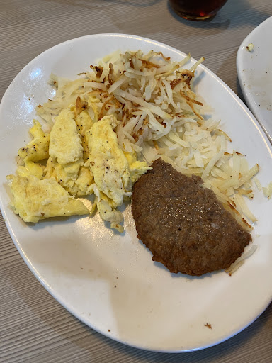 Another period of time passed. She returned with perfectly cooked hash browns, warm biscuits, and freshly cooked sausage patties. BUT the eggs were overcooked.