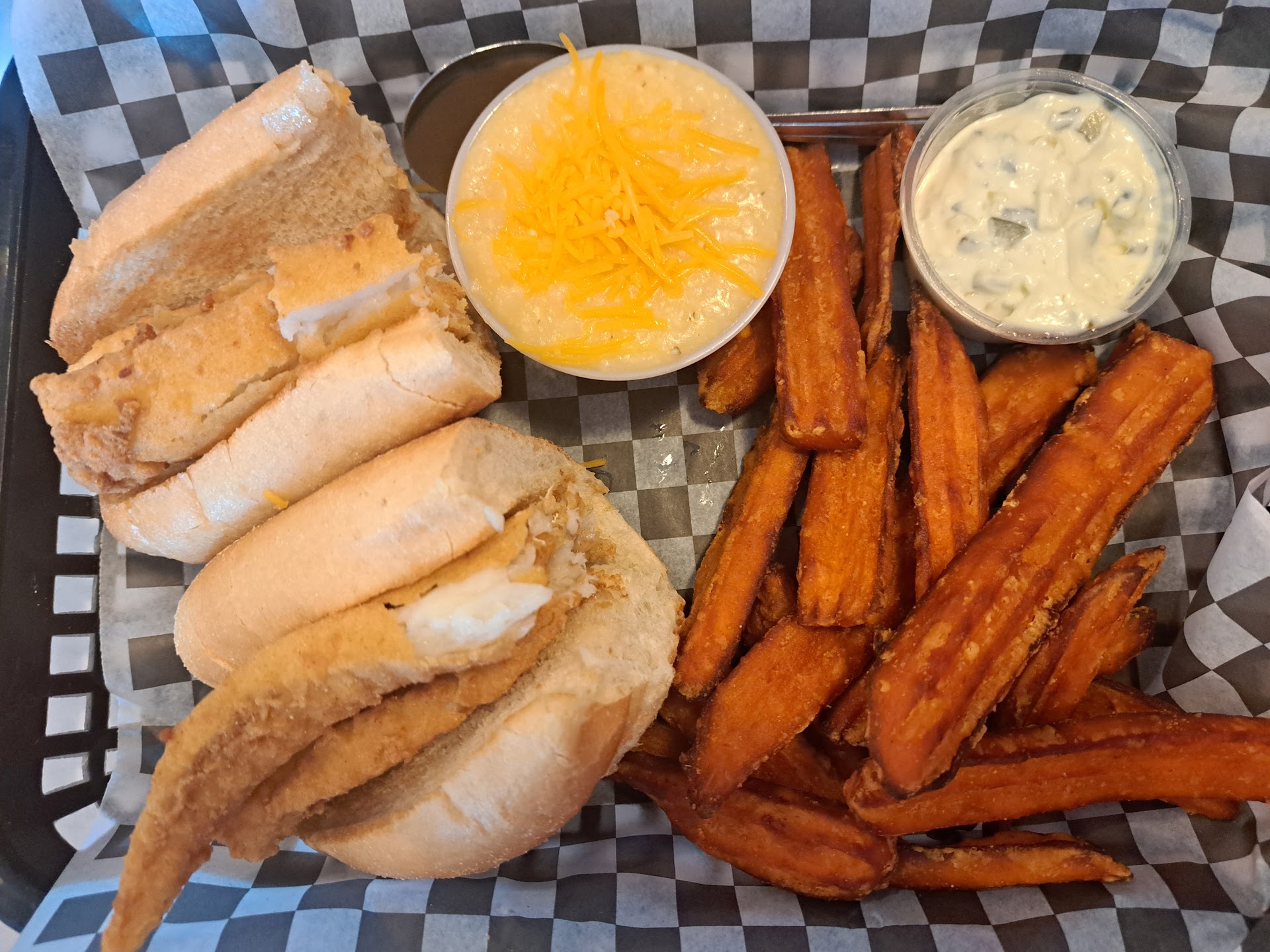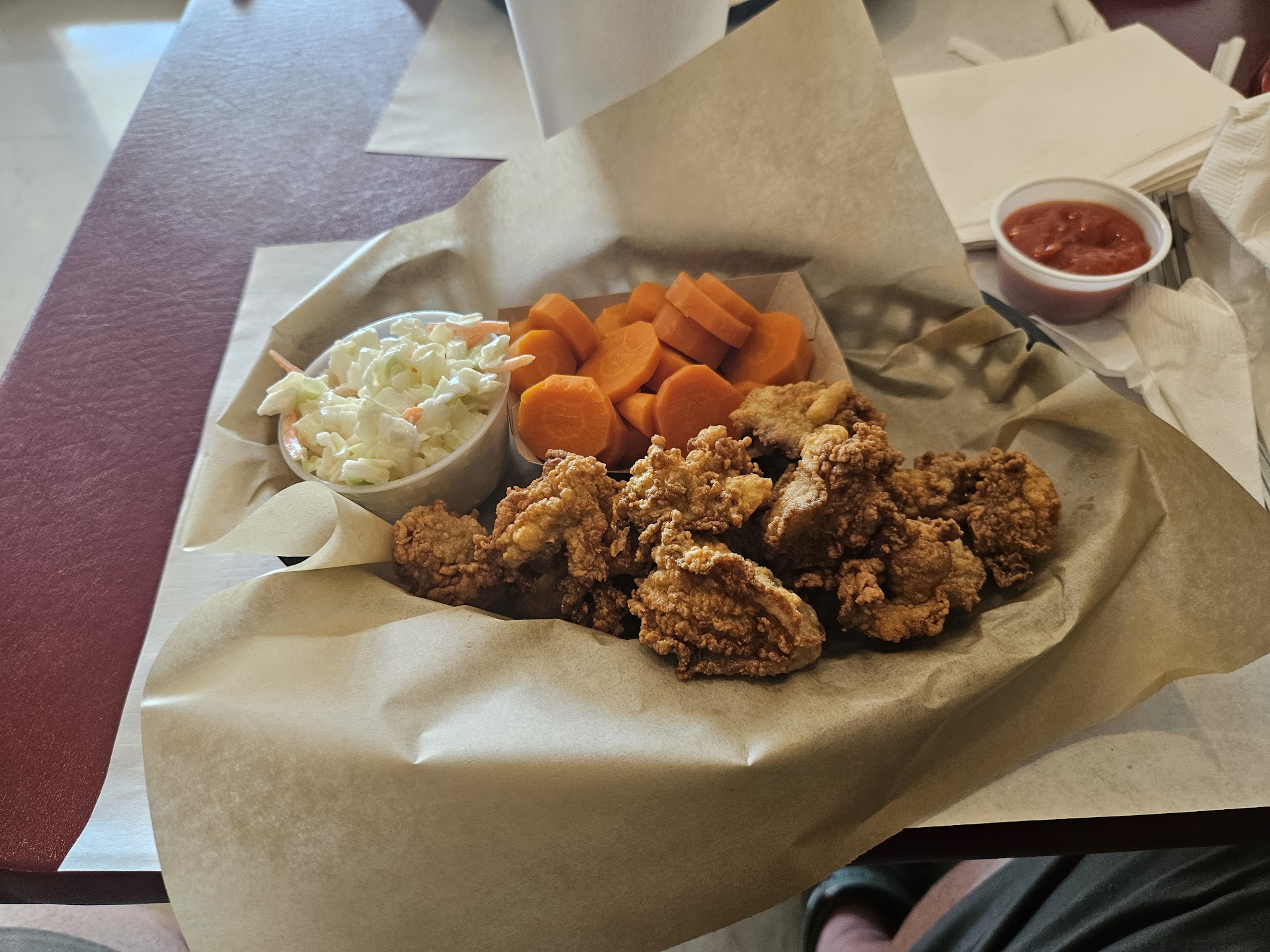 This is a little diner in a shopping plaza which seemed odd for a seafood place, but hey it works! There were 3 of us. One ordered the haddock fish sandwich basket with grits & cheese & an upcharge of sweet potato fries. It came with 2 hushpuppies & coleslaw. The sandwich bread was really too thick, but all was good, no complaints. Another ordered the catfish basket with fries and it came with hushpuppies & coleslaw, he ordered fries and baked beans for sides. He didn't personally care for the beans, but nothing was really wrong with them, just personal preference. I ordered the trio platter with fish, oysters & shrimp. They came with several onion rings, perfectly cooked, hush puppies & coleslaw. I ordered grits & cheese & apple juice steamed carrots. I am a carrot lover, never met a carrot I didn't like, until today. They would be a pass for me in the future. The shrimp was just a minute(ish) overcooked giving it a tougher chew but had good flavor. The fish & oysters were totally on point, delicious & cooked perfectly. The oysters were decent size & plump. I enjoyed them. Both of us who had grits & cheese really liked them, they were perfect. We had no coleslaw eaters in the group, thus we have no rating on that. I was the only one who eats hushpuppies, they were really good. I didn't care for the sweet tea, at all, compared to most southern style sweet tea, it just wasn't good.