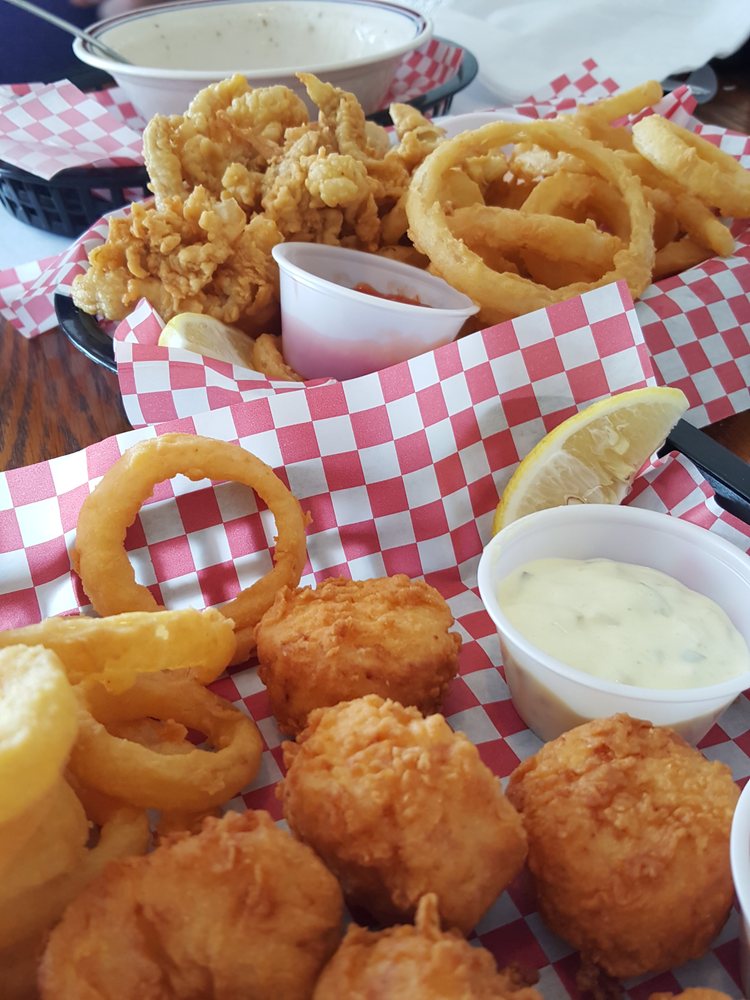 This is a little diner in a shopping plaza which seemed odd for a seafood place, but hey it works! There were 3 of us. One ordered the haddock fish sandwich basket with grits & cheese & an upcharge of sweet potato fries. It came with 2 hushpuppies & coleslaw. The sandwich bread was really too thick, but all was good, no complaints. Another ordered the catfish basket with fries and it came with hushpuppies & coleslaw, he ordered fries and baked beans for sides. He didn't personally care for the beans, but nothing was really wrong with them, just personal preference. I ordered the trio platter with fish, oysters & shrimp. They came with several onion rings, perfectly cooked, hush puppies & coleslaw. I ordered grits & cheese & apple juice steamed carrots. I am a carrot lover, never met a carrot I didn't like, until today. They would be a pass for me in the future. The shrimp was just a minute(ish) overcooked giving it a tougher chew but had good flavor. The fish & oysters were totally on point, delicious & cooked perfectly. The oysters were decent size & plump. I enjoyed them. Both of us who had grits & cheese really liked them, they were perfect. We had no coleslaw eaters in the group, thus we have no rating on that. I was the only one who eats hushpuppies, they were really good. I didn't care for the sweet tea, at all, compared to most southern style sweet tea, it just wasn't good.