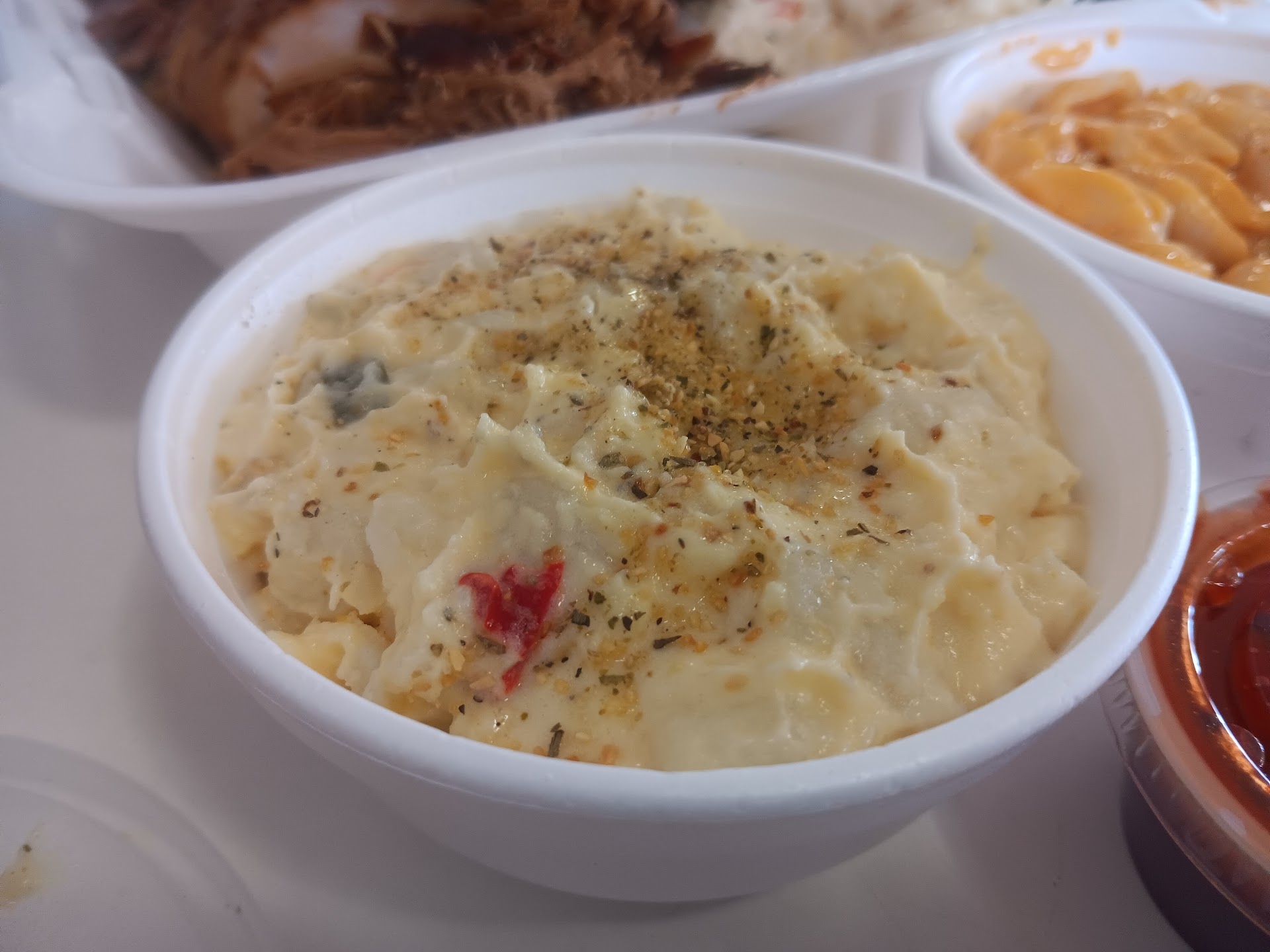 Ā Ā Ā Read moreWe went their first day officially opened. I was fortunate enough that they did a sampling of their meats for me in a box, the chicken was INCREDIBLE- some of the best flavored, and so juicy and tender. The brisket had a great flavor. Iām not a rib or pork person - so I will let someone else review those items. I did witness the size and quality of the baked potato with brisket and it looked delicious! There really isnāt too many places to sit inside. No public bathrooms. And they do have a big fan for those that want to sit outside. Overall, I hope locals and travelers will stop and try them! Itās a great addition to the Mount Enterprise area! The young family that owns it are super sweet and personable. We had a light dinner at my company, so I wanted the to try the chicken and sausage from them, and everyone seemed to love it. Itās a must...