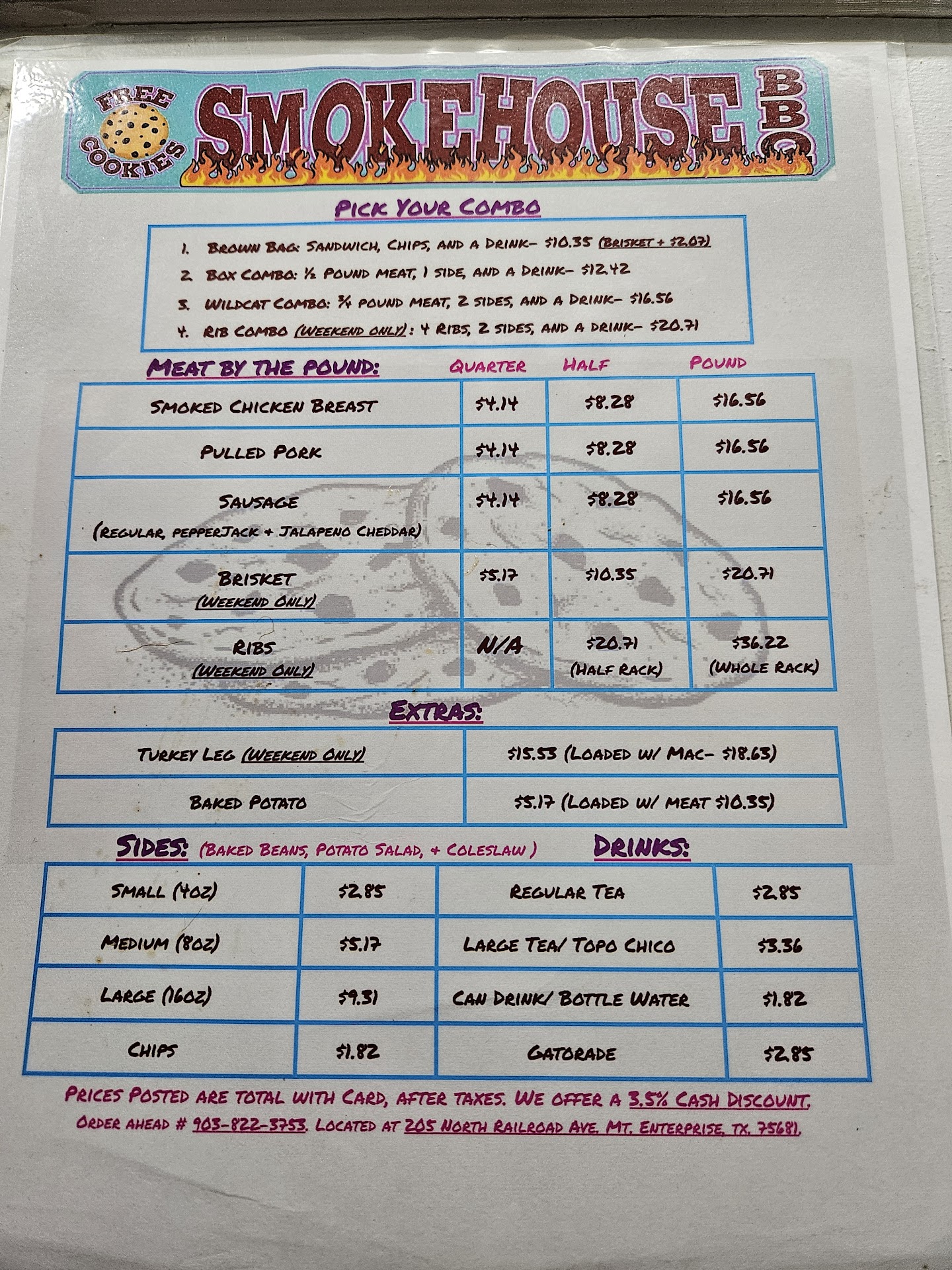 This place has the very best smoked Brisket, BBQ ribs, pulled pork, jalapeƱo & pineapple with cheese sausage. The chicken breast is always moist and juicy, and now there is a "new" breakfast menu and more things added to the lunch menu like hamburgers now that I'm eager to try next. I will update my review if necessary. The potato salad, cheesy potatoes, and coleslaw are always made fresh and delicious. By far, this tiny hidden gem of a BBQ restaurant ranks up there with one of the top five best BBQ places I have been to and eaten in Texas, including cities like Driftwood Tx., Austin area, Eagle lake, SantaFe Tx., Henderson and Alvin Tx. and now adding Mt. Enterprise to my list. My favorite T-shirt purchased at one famous location has a funny quote written on it that reads, "Life is too short to be eating bad BBQ." You will never have that problem at this location in Mt. Enterprise. Travel safe, live long, and eat well to all my new and old friends who...