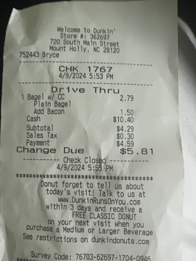 Read moreSomething told me to go to another Dunkin before I came to this new location in Mt. Holly. Wanted to see how this location was since it is new. First off, the location is located in an awkward spot. If you are traveling north from Belmont, you have to make a U turn at the light past this location, once you get there, parking spaces are limited in the front of this place, and some on the back end. I visited this location on 3/25, Saturday morning to get a box of joe and donuts for an event I was attending in this area. First off, the team here are not professional and the manager is questionable here. A lot of teens messing up orders and having conversations that should be communicated outside of work and not for the ears of customers. The young lady that took my order took forever to make my order (I was the only one in the facility at the time). She was too busy conversating and seeing what everyone else was doing, the manager had to tell her to finally make my order after some time. The box of joe when they handed it to me , the handle was completely broken off. Had to hold from the bottom. Also, when making the joe, the young lady made hot chocolate instead of coffee that I ordered. I also asked for extra cups and they were going to charge me .25 cent EACH cup. Never had this issue with any other Dunkin I have visited. Due to this incident, I WILL NOT be returning to this location. So sad, I wanted to like this place since it's the first coffee shop to arrive to this area. It's a...