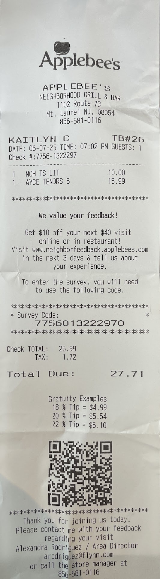 Read moreI had called in day before to make reservations for a group of 28 the manager asked me to call in the next day to just make sure we was coming so I did they said ok they would see us around 5pm how we get there and they have 12 seating in bar area 12 seated buy door and a whole other set of tables on back end we asked to speak to manager cause we wanted to be seated in same section she said she could not do that cause they only had 3 servers but we was never told that on the phone so we try to make the best of it the ones that were sitting in bar area waitress was rude they had to say something to her about her rudeness. The ones that where seated buy front door waited like 30 minutes never got drinks or any kind of service they left and went down the st to chilli it was the worse birthday dinner ever the manager and some of the staff was so rude. We waited a wail for our food and we was ok with that but not getting any service or being split up when that whole back section was empty when we got there was crazy the manager Emily didn’t even try to accommodate us she didn’t even care. We stayed because we was such a big crowd but it so was not worth it and really messed up the whole birthday dinner. I took a cake to sing happy birthday and we just ate and left never sing I will never plan anything else at this Applebees on RT 73 Mt.Laurel. If you can not handle large crowds it should of been said when I called in to make the reservation. Staff also need some help with there attitude and just not caring about there customers I have eaten here many of time and this was...