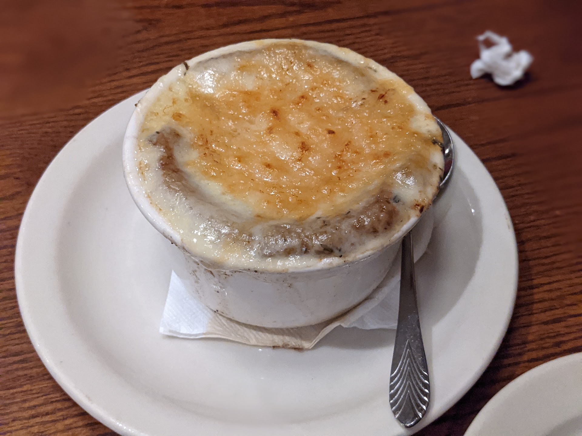 Food: We ordered a t-bone steak that comes with a pretty good side of tobacco onion and, my choice of, garlic mashed potato. The steak quality is great, nice beefy flavor and a good amount of fat but it's completely bland, not sure if it was seasoned at all. Putting salt on it myself is... fine but definitely nothing like a pre-seasoned steak. The garlic mashed potato is mundane but it was actually quite nice that it was not very salty unlike a lot of other restaurants. Despite all the relatively bland food so far, I still did not add more salt because the French onion soup was just so incredibly salty. That was a poor. We also got a bacon burger with fries. The fries were enjoyable however the burger was not. The bacon was a bit burnt and the beef patty was bland and dry, which really kills all chances of it being a good burger.