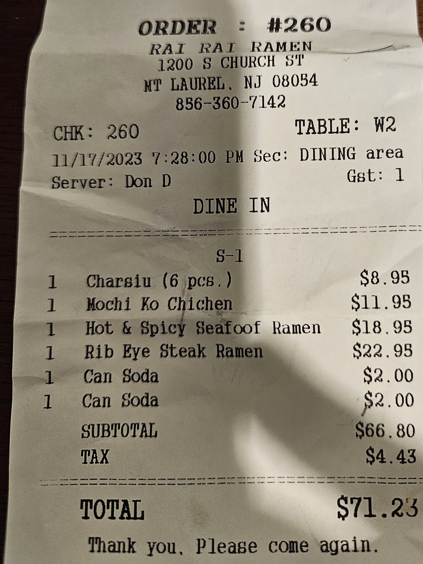 Dear rai rai ramen, Let me start off by saying that your service and restaurant were neat and clean! My experience was pleasurable in more than one way. to my excitement and surprise, your ramen were most antiquate. the chicken, on the other hand, was average and a-bit undercooked. Your ramen broth, was excellent but in total underwhelming due to the firmness of the noodles. The following I can look past due to the exciting experience I had in your take home box. I have found myself to be able to enjoy the pleasure of your food in more than one way. I experienced a lack of privacy when one of your courageous employees rudely interrupted my private food bath in the bathroom of your establishment. As she opened the door I could only stare with one glance, not knowing the monstrous deed i have completed. My feet, in your ramen. The foot bath. Something so familiar yet so strange. I was at the peak of my enjoyment when she looked at me with despair. She opened her mouth and only let out a quiet sigh, as would I, had she not interrupt my private foot bath time. I bolted out the door, feet wet and trembling, covered in ramen, it’s residue and others. As I franticly darted out into the eating area, all of your other customers stared at my neglected, dripping feet. i went back inside, grabbed my ramen, and bolted out the door. lip quivering, I dashed to my car, only to find out, I had accidentally drowned my keys in your dangerously pleasurable broth. now i’m sitting here, yet again, feet in your ramen, writing this review. I’d encourage everyone to at least try it, so that i feel less ashamed for the fun I am...