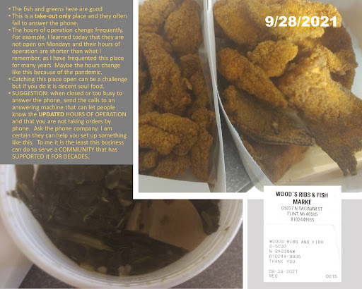 9/28/2021 Visit The fish and greens here are good This is a take-out only place and they often fail to answer the phone. The hours of operation change frequently. For example, I learned today that they are not open on Mondays and their hours of operation are shorter than what I remember, as I have frequented this place for many years. Maybe the hours change like this because of the pandemic. Catching this place open can be a challenge but if you do it is decent soul food. SUGGESTION: when closed or too busy to answer the phone, send the calls to an answering machine that can let people know the UPDATED HOURS OF OPERATION and that you are not taking orders by phone. Ask the phone company. I am certain they can help you set up something like this. To me it is the least this business can do to serve a COMMUNITY that has SUPPORTED it FOR DECADES.