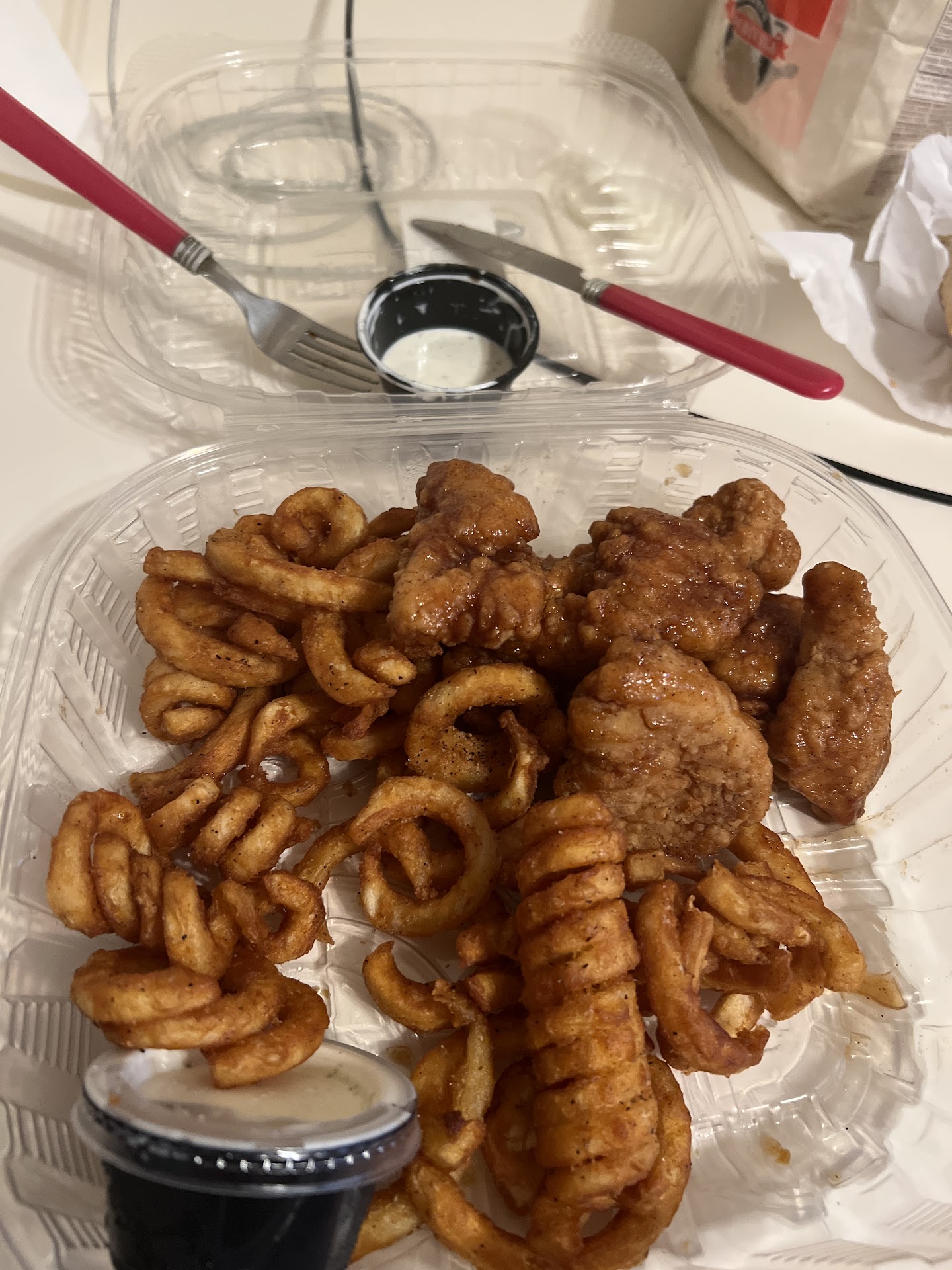 For those without a coupon or the ability to fry at home... The bone-in wings came soggy but fairly large and fully cooked, the boneless wings were again sizeable albeit not very different than a Tyson frozen variety.