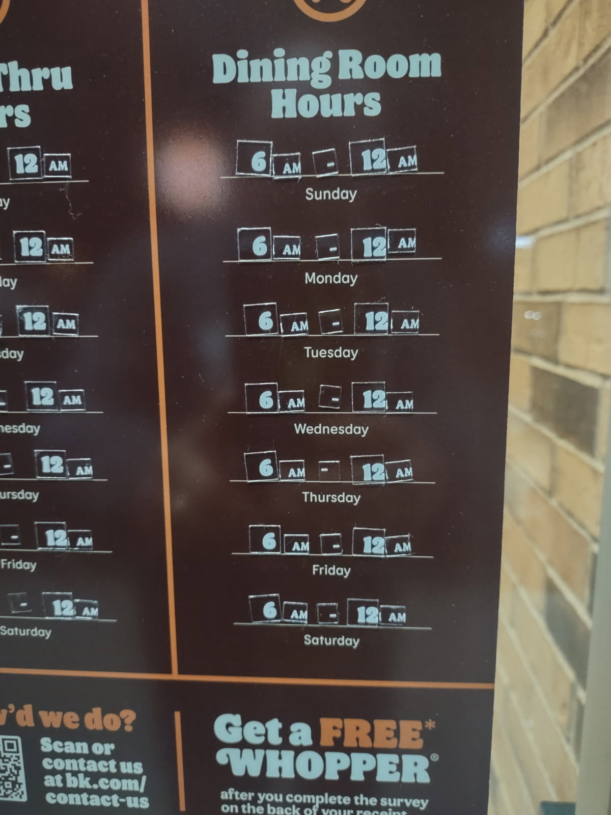 If I was able to leave a zero that is what it would be. The first time we went we were ignored at the counter and the lady even walked out and decided to have a smoking break! We went somewhere else and thought for whatever reason we would go back and give it another try. Today, March 1st, 2025 we went back and check the door to see what the dining room hours were. It clearly read 12:00 a.m. we went inside bought our dinner and sat down about 9:45 p.m. our fries we're obviously sitting there for quite some time as they were cold and with no one else in the dining room we definitely should have had a fresh set of fries. I decided this was not worth arguing over. We were quietly eating on our own as there was no one else in the dining room. At 10:15 one of the workers was sent out by the manager to ask us to leave. He explained that the dining room closed at 10:00 p.m. I explained that the door didn't say the same. The young kid was unsure of what to do or say so he walked back behind the counter. I approached the manager and bluntly said that I've never been asked to leave a dining room that closes at 12:00 a.m. and when we were quietly sitting there still eating. He said again that the dining room closed at 10:00 and I explained to him that the outside sticker said 12:00 a.m. he said that I was not correct and so I walked him out to the sticker and showed him exactly what it said. At this point he was being very disrespectful and rude saying that he's not from corporate and can't help that. We will never return to this Burger King again and we will definitely spread the word elsewhere. As we were walking to the truck he repeated that his boss said that they had to close it at 10:00 and I told him that he should Mark that out with a permanent marker and change it to...