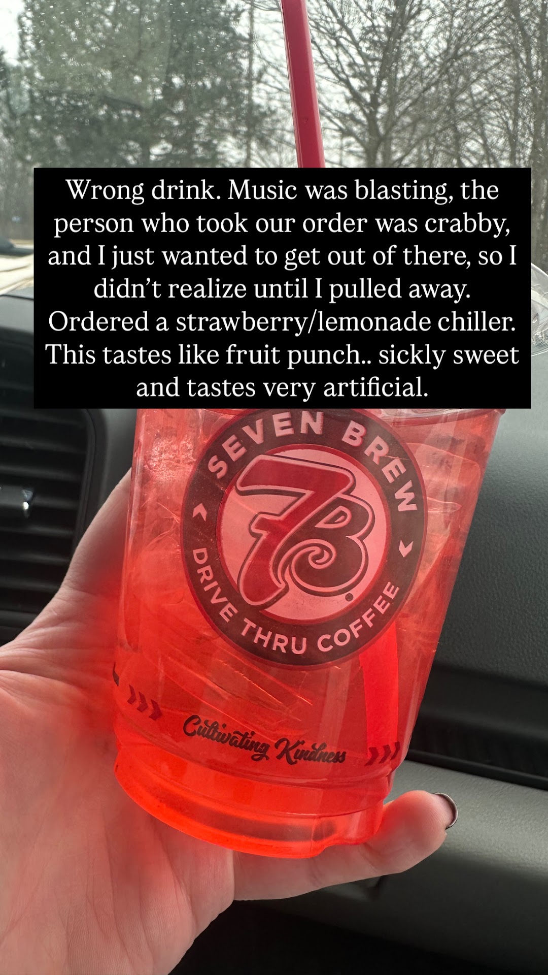 I’m not sure if it was just an iced version of strawberry lemonade vs the chiller I ordered, but it tasted like fruit punch? Just sickly sweet and artificial. My husband tried it too and said it tasted like a bad version of fruit punch. Not good at all. The chocolate shake was icy, bland, and very sweet—sweetness was the dominant flavor, just not good. All in all, this was a bad experience from start to finish, and a waste of money. We won’t be back. I’d love a good drive-through alternative to the big coffee shop everyone knows, but this...