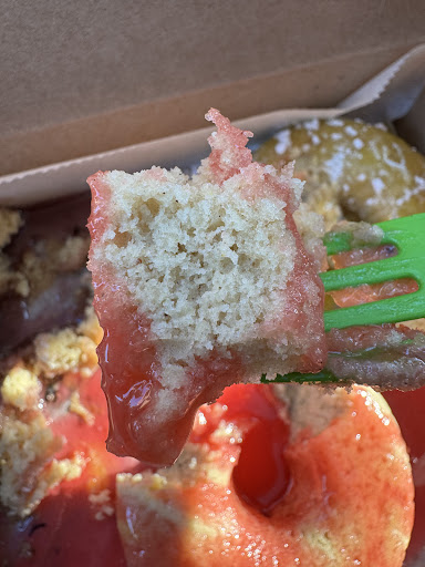 Unknowingly to me, the donuts would be pulled out of a fridge/freezer and microwaved. I was still hopeful but knew this would be less than made to order and more of a grocery store hack. If they were made in house then stored, Iād be shocked. Instead of glazes that are pictured, my donuts came with fruit sauces that were runny and intermixing in the box within moments. This compromised the flavor that I expected to pay for. I began eat a bit more into the donuts and realized there was a hint of cinnamon flavor too in the microwaved donuts. (the speckled can be seen in the photo of donut piece) and this only tasted decent with one flavor I selected (blueberry)ā¦
