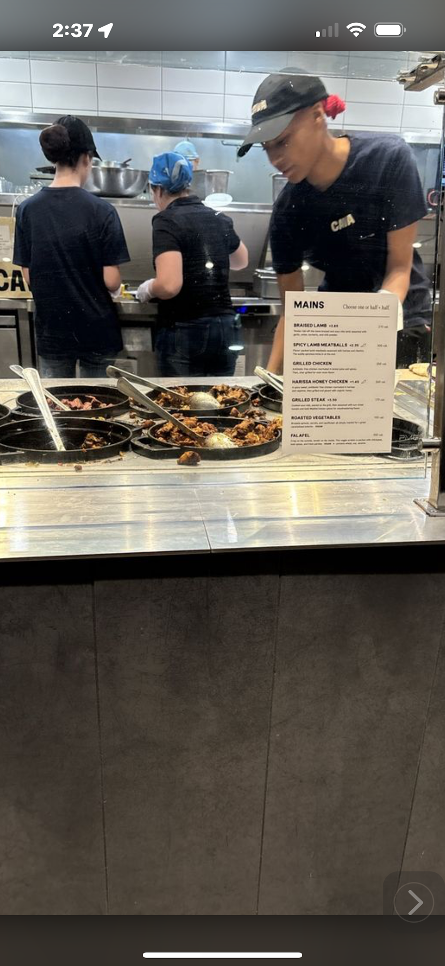 Read moreI entered this location at about 8:30 p.m. on a Sunday night. It was a little busy and the line was backed up. Most people were waiting on chicken for their bowl/pita. I observed one girl seemingly working hard while everybody else just stood around. There was only one person in the kitchen. The manager on duty seem to be doing inventory and later I saw her sitting down. She was no assistance to her team which was wild to me, especially seeing how busy it was. When the proteins finally started coming from the kitchen, it was still a mess because the bar was not stocked with the ingredients needed, even though they had plenty if time to do so while waiting on chicken. Also there was one worker making to go orders who cut into the line for the restaurant orders and we're making the other workers confused. Bowls were getting mixed up, simply because she wasn't at her designated to-go bar area. The workers were constantly talking to one another and not necessarily the customer and it was quite annoying. They had no regard for the customers time. The customersin front of me exhibited great patience with these workers. They were clearly busy with the line that was more than out the door and nobody seemed to really care. They were out of a few items including pita chips which is one of the highlights of eating at Cava. They said the fryer was down..I honestly don't believe them. Luckily the food still tasted good but I definitely missed my pita chips. Had this been my first experience at Cava, I would likely not return just based upon the atmosphere and the attitude of the workers but this is not my first time at Cava and I will return to...