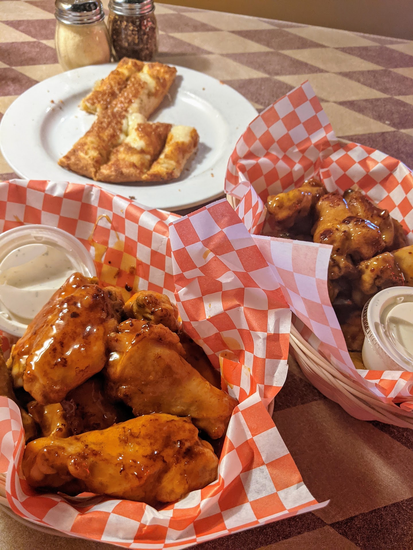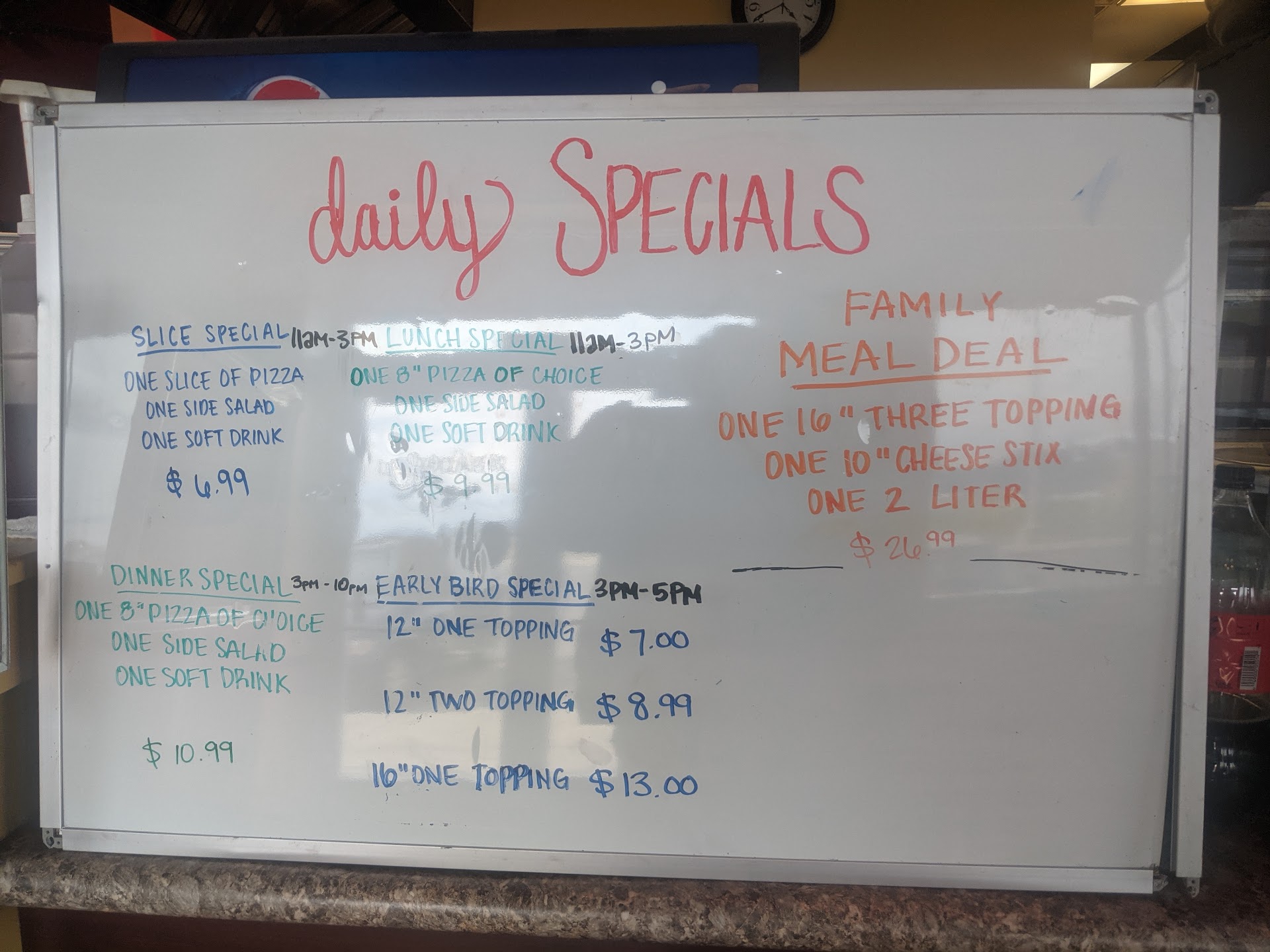 UPDATE from a year ago: Still has great prices and the food looked beautiful! However and unfortunately, our experience this time was less than desirable. We ordered a simple cheese bread and wings (.50/wing - great Friday special). First, it took us 45 minutes to receive our order. The wings are precooked (I'll tell you how we know this in a minute), and the breed was pizza style, so the order shouldn't have taken more than about 10 or 15 minutes to cook. I wanted to remove a star for that, but it was a busy Friday night and a one-time occurrence so far, so decided to cut them some slack. Then, when it finally arrived, the bread was fantastic (as usual), but one bite into our wings and it was obvious something was wrong - they were stone cold in the middle! Not luke-cold like they stayed out after being cooked waiting for the bread... Like refrigerator cold and not warmed all the way through. 😝 Thank goodness they weren't raw in the middle, or that would have been worse. This is how we know they're precooked -thankful for that. Reluctantly, one star removed. Next, when we alerted the teenage staff about it (no adult or manager in site), they apologized, and that they'd cook more for us. We didn't want to wait again, so we ordered them to go. 5 minutes later, they gave them to us, piping hot...hmmm. took 5 while minutes, not 45. Ok, we were happy we are least didn't have to wait the second time. So we got ready to pay at the register, and then then the cashier actually charged us the regular price instead of the weekly special for the wings! If I hadn't have noticed the cash register ring it up and corrected her, we would have been charged full price for a meal that was cold and old. I'm not inclined to blame the young staff about this, because was annoyed and concerned that there was no adult staff present to help. This incident seemed to be a training error on how to 1) properly cook the food, and 2) how to properly handle the problems that arose with the customers. Another star gone for that, which I don't apologize for at all. 😒 We'll probably try this place again, because we like to support local establishments, but this was a big strike against them for us.
