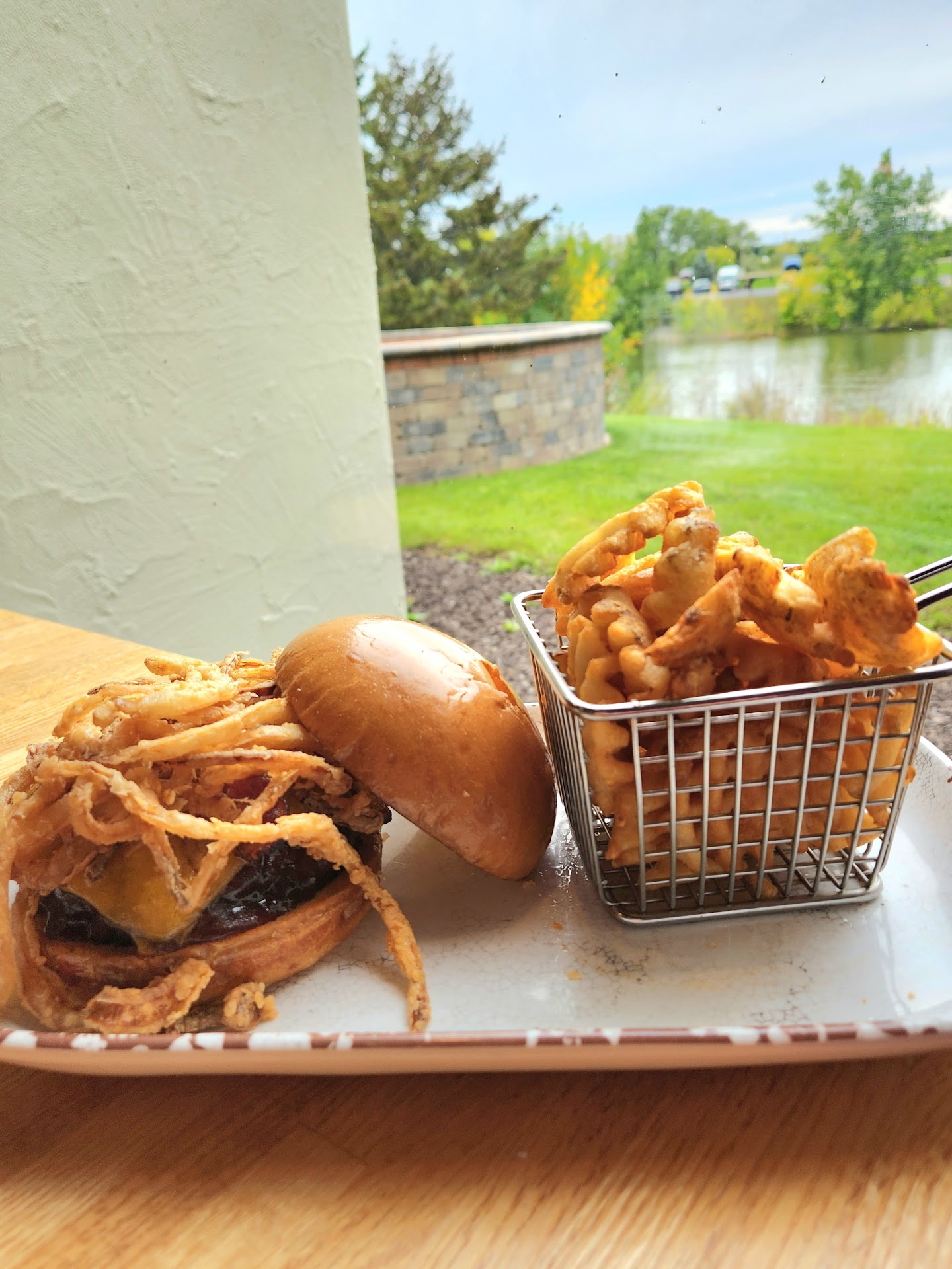 No matter, just means we didn't have to wait for anything. Staff was friendly and accommodating. Our food arrived timely and was fresh and hot. A real bonus, those window seats looking at the fountain or little pond outside make for a really nice dining experience.