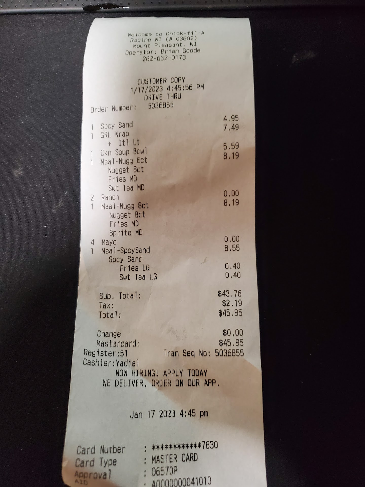 I have always spoken very highly of you, of your food and of the speed of your service. I dont regularly have the chance to visit your establishment, as there is no one near me in Green Bay. Normally your food is extraordinary, however today it was a disappointment.Ā On our way back from Chicago to Green Bay, we realized it wasn't Sunday so we decided to stop at your restaurant. We ordered 2 spicy chicken deluxe meals, both with a side of fries and a soft drink. We quickly received our food, but once we were back on theĀ road we realized our order was not right. Instead of 2 juicy spicy chicken deluxe meals, we received 2 very greasy and old looking sandwiches with what was supposed to look like chicken, we also received greasy chicken nuggets of which the breading fell allĀ on our shirts including the polynesian sauce and we had some cold fries to enjoy with that. We did not have time to come back to the restaurant, because I have to start work at 4PM in Green Bay and it would take us ar least 2 hours to drive back. I'm sad toĀ tell that I was unhappy with today's order at chick-fil-a and I would like a refund of the money I lost. Especially after the ranch sauce exploded on my t shirt.