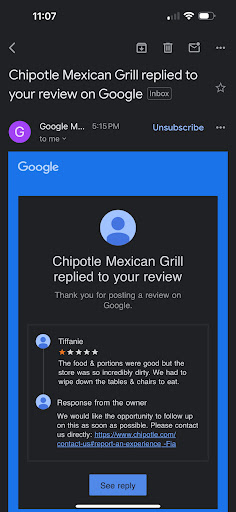 Read moreWe eat at the location in Mount Pleasant frequently. I picked up dinner order on Saturday evening. The chicken tasted burnt, both burritos ended up in the trash. I called and said I normally do not do this, but that was my dinner and it is ruined. I spoke with Emily who I was told was a manager. She said I could drive back, 40 minutes round trip or I could get a refund. I said I am not driving back, please do a refund. She said she spoke with James, the General Manager, who said I would need to bring the receipt and I would get a refund. I said I had to go to the post office Monday morning so I would come back then. I asked if that would work. Absolutely. I walked in at 10:30, door opened. I dd not realize they opened at 10:45. I asked for my refund and I was told that there was no manager there. I said I was told James the General Manager would be in, they said he is not the General Manager, he was just hired. So no manager? They are supposed to be here but they are not. I asked if they could call James and I was told that they did not have his number. The girl up front was very friendly. When I walked in another surly employee said he would help me. He told the girl to lock the front door and give me a refund. She said I do not know how to do either. He made a call and said they cannot do the the refund, Emily will be in at 3:30 and I should come back. I said you messed up my dinner you are not messing up my day any further. He said I should give him the receipt and he would take my name and someone would call me. I said my receipt is the proof, there is no way I am giving it to you. I asked the girl, doesn't Chipotle sell gift cards. I plan on eating here again, can I just get a gift card. She said she did not know how to ring it up. She called another employee at home who explained it to her over the phone. How is it possible to so poorly...