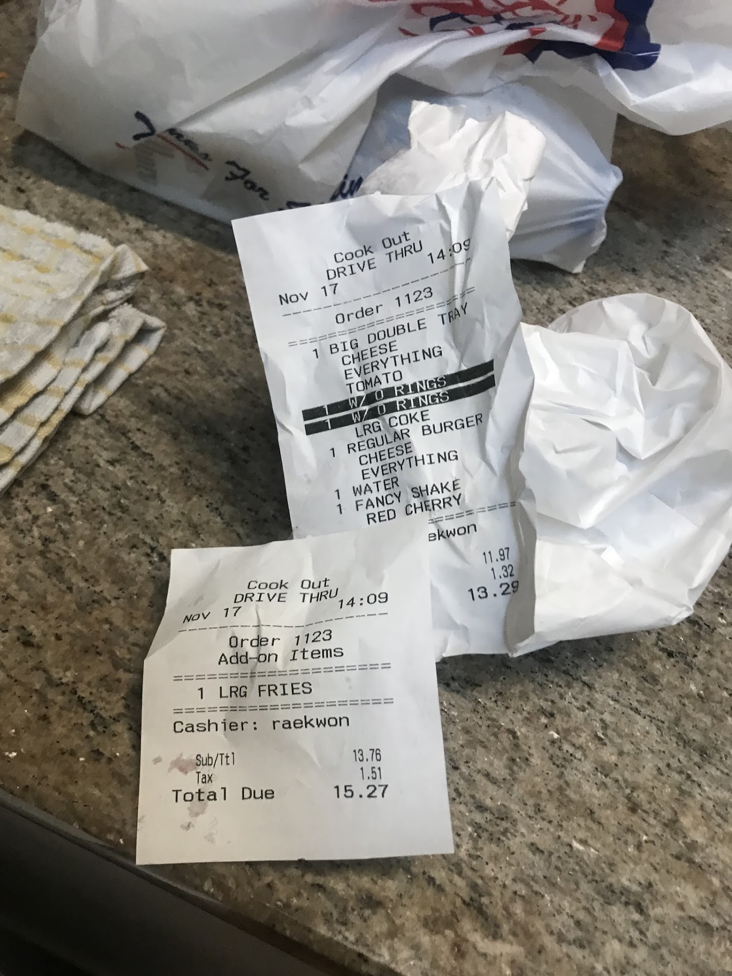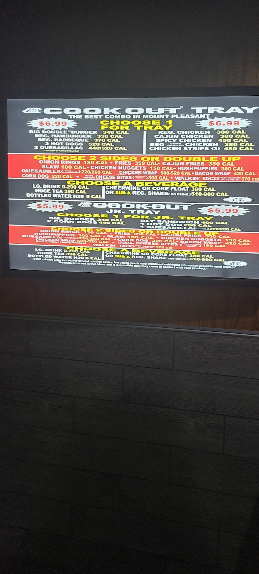 Read moreBought a few burgers on Friday, November 17, 2017 at Mt. Pleasant SC location. Brought home to eat. Wife was eating when she let out a shrilling scream. A foreign hard object in the burger cracked her rear tooth IN HALF on what she described as a metal object in burger she was consuming. Contacted company. Sent us a letter and a coupon for food. What a joke! Took one week for Cook Out insurance company, (Nationwide Insurance), to call us concerning this incident. Seeking minimum 1800.00+ reimbursement for dental bills to fix. Insurance Denied today. Worst experience of our lives. Permanent damage to structural integrity of tooth in wife's mouth which will require follow up care and more expense. This company and Nationwide Insurance, (in our humble opinion), cares less about its customers. Based on our experience, we deduce that COOK OUT's food Is UNSAFE to consume. Next time you bite into a Cook Out burger, (you are a fool to expose yourself to this company's products due to apparent lack of quality control by either the company or company food suppliers), know that you perhaps could be swallowing something that could crack your tooth in half, (as is in my Wife's case), or imperil your internal organs. What havoc and damage would that foreign object cause to your intestinal tract if it made its way through your bowel system? That foreign object not meant for human consumption, could tear the intestinal lining up in your digestive system and cause internal bleeding. ...