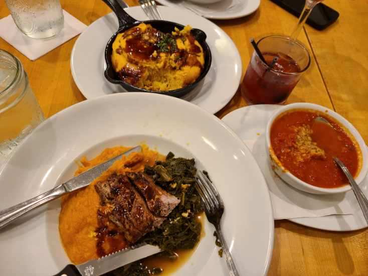 On Saturday my soup arrived with my entree, coffee & rosemary grilled pork tenderloin, maple smashed sweet potatoes, braised kale with blackberry molasses. We also ordered the gluten free cornbread with blackberry molasses. I don't typically overeat at restaurants but I had to try all of this. For cocktails we had the blueberry lemondrop and the blackberry bourban cooler.
