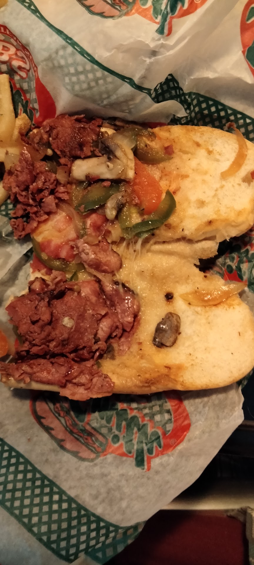 For my hubby I ordered a 12" Hot Pastrami and those famous fries with a big drink. The sandwich is exactly what you want in a hot sub. Fresh bread, crusty outside and soft inside, loaded with tender meat so perfectly sliced! Most places slice too thin or too thick and sloppy. Jon Smith's does it right! Just the right amount of toothiness. The balance of meat, cheese, and condiments was perfect, the meat so flavorful and fresh! The mustard stood out as very sharp but not overpowering.