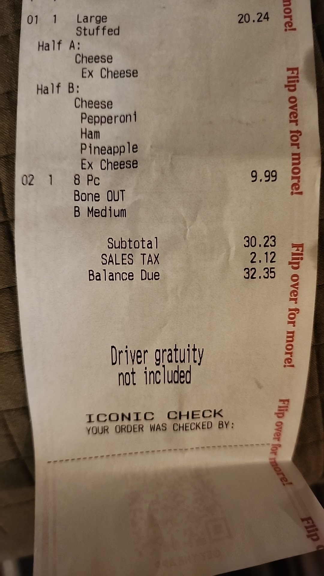 Did the online order for pizza and wings. It said 15 mins and it was to the T 15, killer timing for me to swoop over grab and go. Recently ordering wings from anywhere you half to expect them to be less than normal quality, a get what you get but these boneless wings were phenomenal. Highly recommend boneless wings, didn't cheap on sauce or quality, no place on the app to add a sauce so when picking up I had asked for ranch and she didn't hesitate to grab anything that I had wanted. I did a half and half pizza but for some reason it put both the toppings I had chose on the same side of the pizza and left the other half straight cheese. My receipt does show an A - B side of the pizza broken out that both toppings went to the same side and the other was to be cheese. Pizza looks amazing and didnt care about the mix up but called to ask for next time how I can correct the order for an actual half and half and she had walked me through the ordering process and said that was definitely the online side that had made the mistake as she went through it and came up with same results. I said next time I will just leave a note on the comment section for special requests I'm happy with what I got so no worries. She insisted they make the pizza I had asked for originally and said they'd even deliver it. Hands down one of the best experiences I've ever had with a mix up that I should of caught or made the comment on, but didn't. So being that I was ok with what i got i just wanted verification on how to not make the same mistake next time and they went way above and beyond to make sure it was right. 5 of 5 is not sufficient, they need a 10 of 10 for service and...