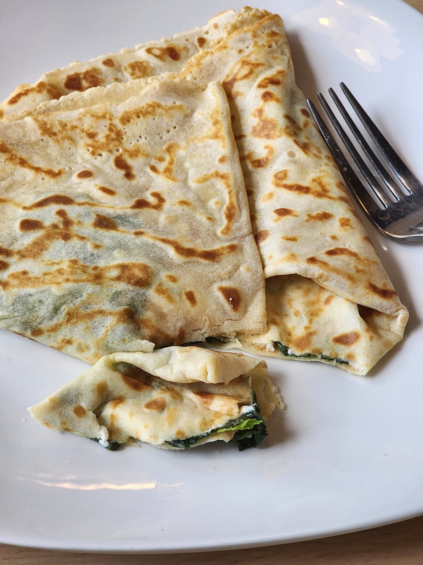 The regular at the counter is more friendly than the guy behind the counter. There was one couple in front of me looking at the menu and one group of boys all sitting down with the drinks and food already. Once it was my turn to order the guy said “it’s going to be awhile there are A LOT of orders in front of you” I said no big deal and waited….and waited…….and waited…. All while he’s running around like chicken with its head cut off making 2 crepes.He took my order looking very overwhelmed and annoyed at my audacity to order something at this establishment. Paid with cash and got an exasperated sigh. Sat down to wait for my drink (just a drink bc I knew better) he did not change his gloves between making orders. My 30 minute wait was up and my latte was lackluster. Burnt esspresso and too much syrup....