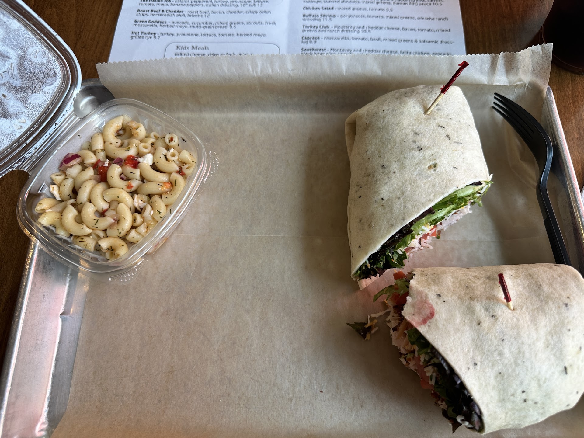 Had lunch here earlier this week with a friend. I ordered the turkey wrap with a side of pasta salad and my friend had the Rueben sandwich with a huge cookie for dessert. Pros: both the turkey wrap and Rueben were good portions. The wrap was a tad dry and I had to ask for an extra side of ranch to dip. I had a bite of the Rueben and it was by far the best thing ordered. Cons: my biggest complaint was the wait. I arrived and there was no one in line. Placed our simple order of a wrap and Reuben. It took 30 minutes! The pasta salad was extremely dry and tasted a day old.