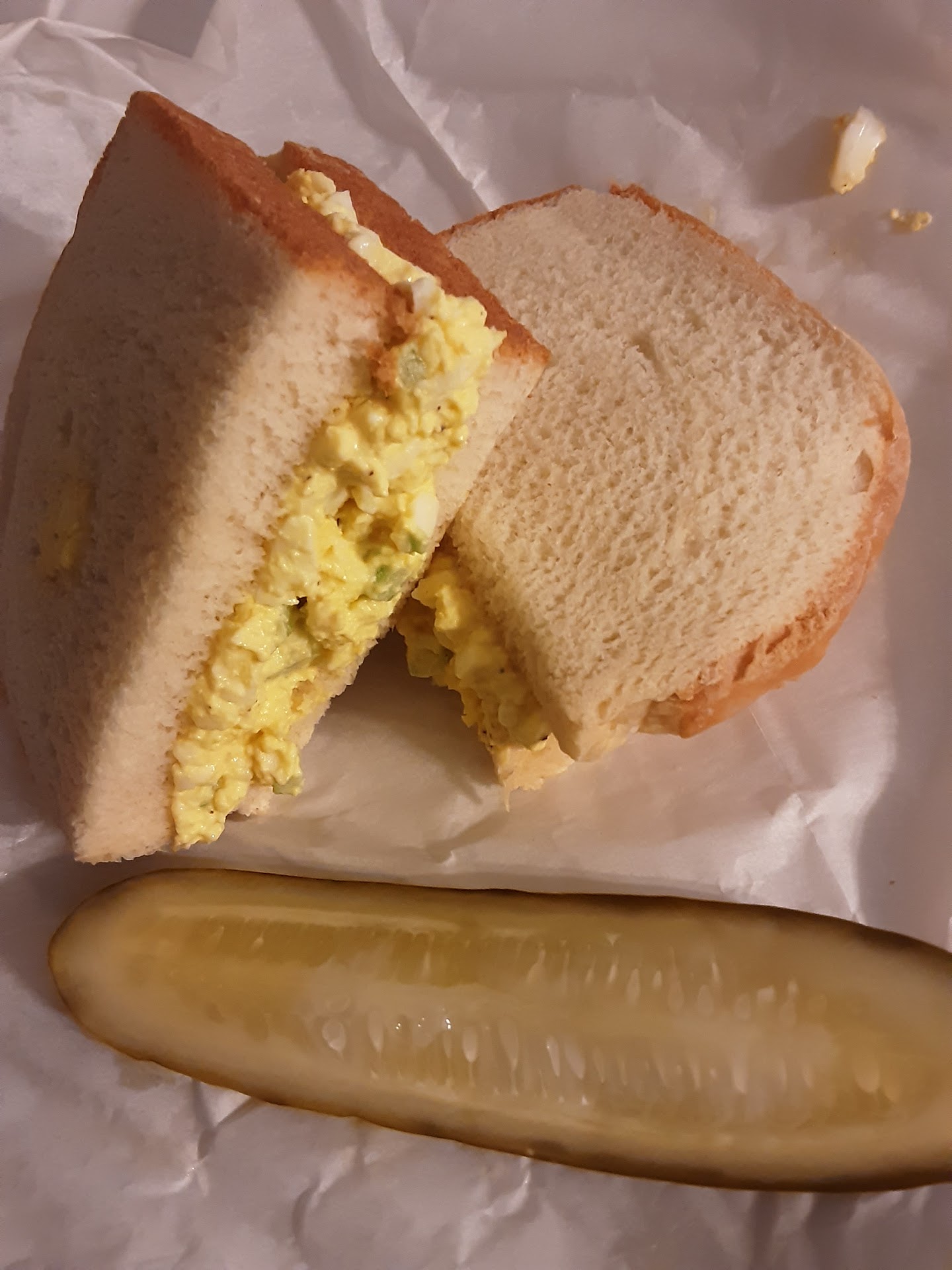 Got the food home and bit into my pillowy, creamy egg salad sandwich. Bread so soft, flavor so mild, this is comfort food for sure. The corndog was a corndog. I think it was all-beef. You can't mess up a corndog. Later, my Chicago dog beckoned, and it was amazing! The pickle is mild, the sport peppers zingy, the tomato balancing it all out. Oh man, I need another one.
