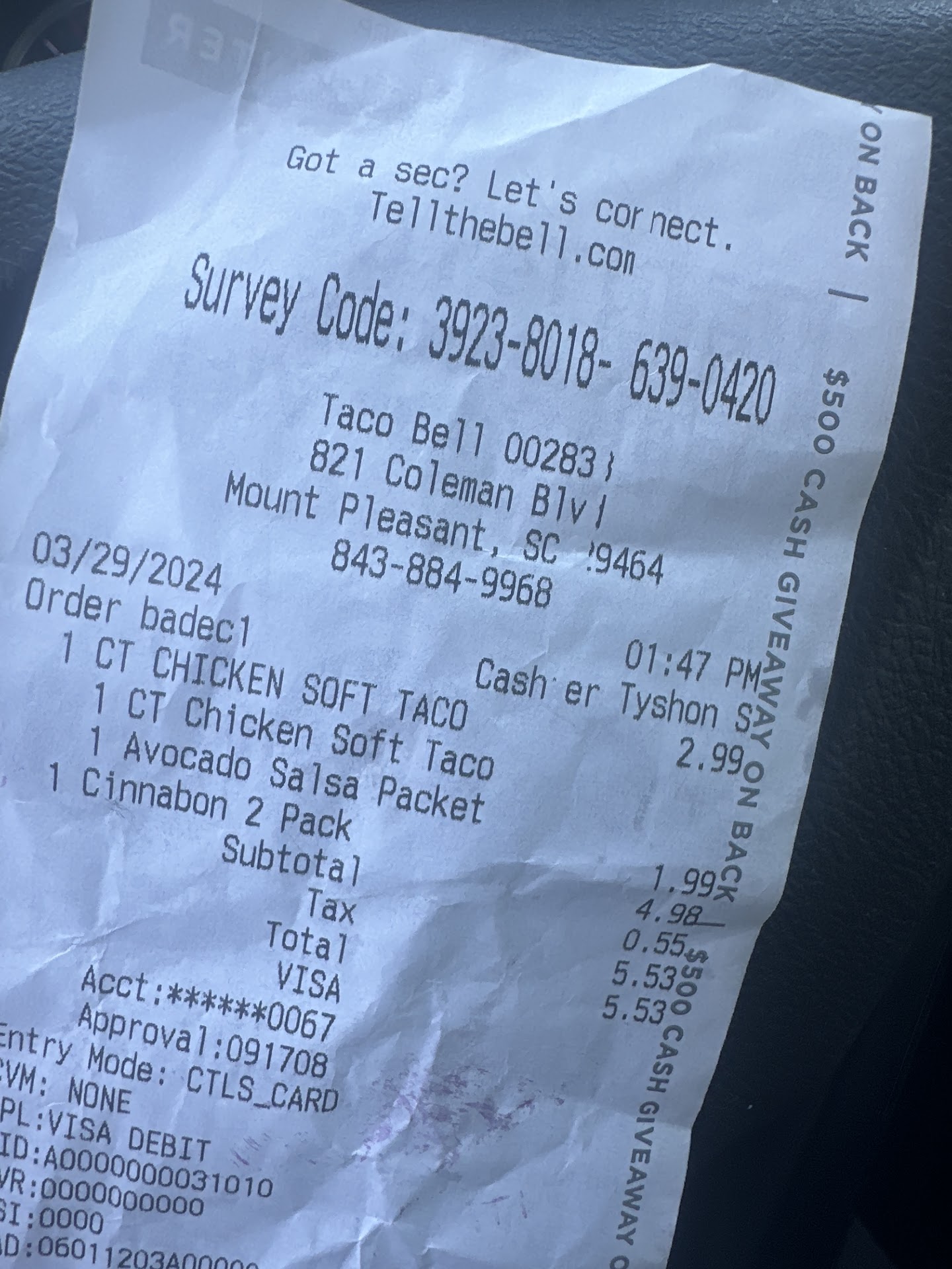 Read moreWent on 5/11 and ordered a doritos locos taco supreme, nacho fries and a grilled cheese steak burrito with some sauces online for a total of around $12. For some reason this location is drive thru only, but they let me go inside for my order since my car was not going to be able to clear through the drive thru. The person who seemed to be the supervisor greeted me and gave me my order, and even offered me a drink, which I was very grateful for. Unfortunately, the food was not up to par. The fries were soggy and not warm at all, like theyâve been ready awhile, and the cheese dip was lukewarm at best. The doritos locos taco was not supreme, and the shell itself was stale, like itâs been left out. Finally, the steak burrito had only a couple of pieces of steak only on half of it, which was a little disappointing considering it costs around $5-$6, and I didnât even get my sauce packets in my bag. I know itâs not a 5 star restaurant, but considering I paid for food, I would at least like it to be edible. I just wish their food quality went hand in hand with their...