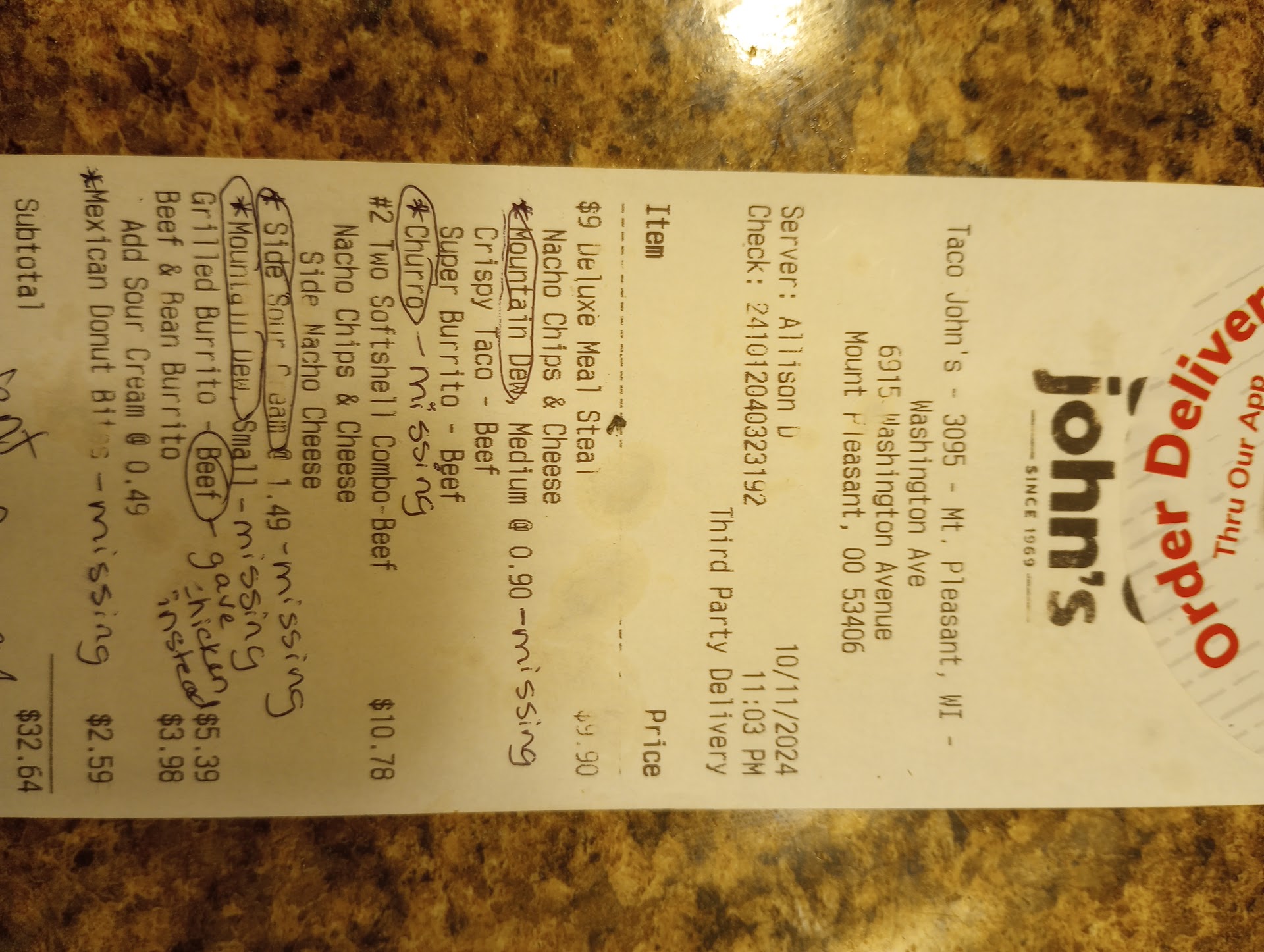On top of that, all three times, staff were friendly, polite, and professional. Nothing like Kenosha where staff don't care and aren't shy about it. It's great to finally have a Taco Johns with courteous, well trained people that's local to me. Will definitely be a...