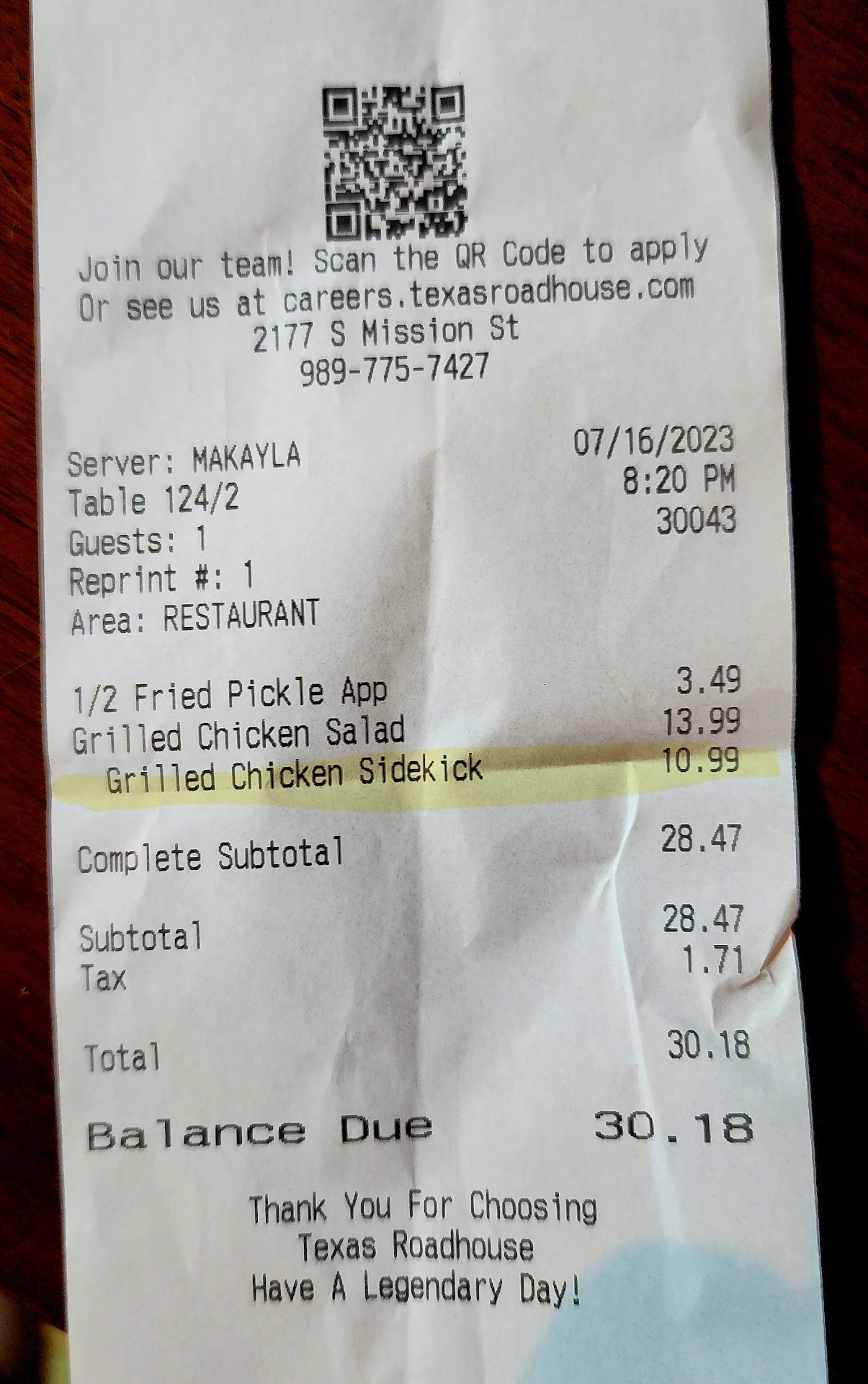The food itself was delivered promptly and was hot and fresh, which was a positive aspect of our visit. However, what dampened our experience was the pricing and the response we received when questioning it. As someone who has frequented Texas Roadhouse before, I am aware that they tend to skimp on chicken in their dishes. Therefore, I requested double chicken in my grilled chicken salad, for which I was charged an additional $10.99 on top of the $13.99 salad.
