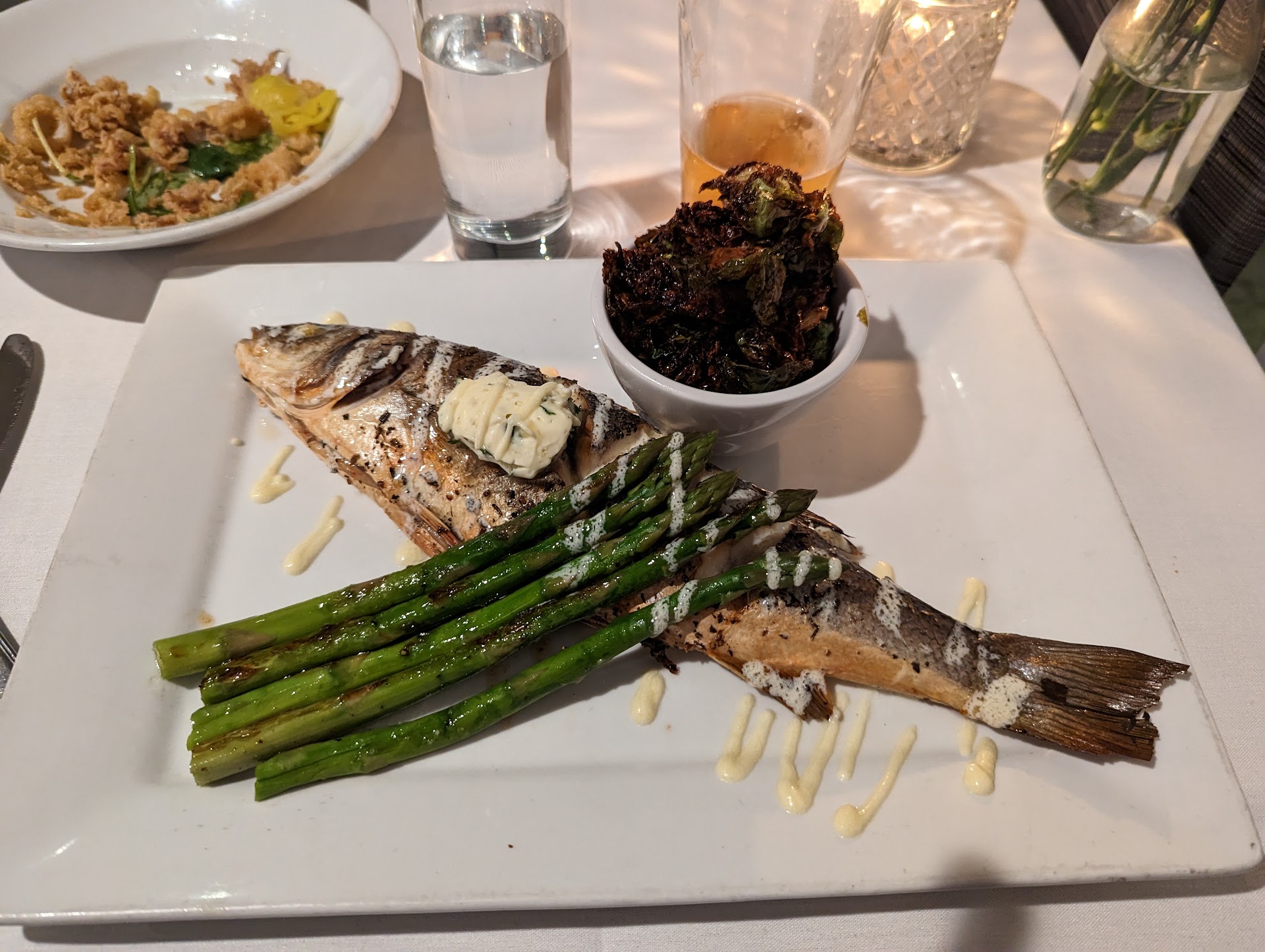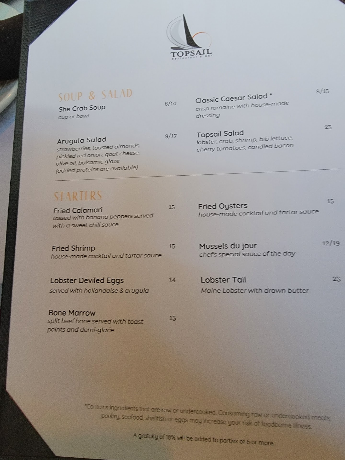 Read morePrior to tonight we have not been into Topsail in about 6 months and we have always enjoyed it. We made a reservation because they had always been super busy before. We arrived a little early but were seated immediately by a very nice hostess. They were not busy at all. We waited for a while and the hostess returned and poured us water and said that our waitress would be over soon. After waiting a bit longer the waitress came over and said that she had just been given another table. You could tell that despite the restaurant not being busy she was spread a little thin. We started with a small Caesar salad that was big enough for us to share sadly it was very bland. Upon the salad being delivered and taking our entree orders the waitress said she was going to bring hush puppies. The hush puppies never arrived, which was fine because we really didn’t need them but….. My wife ordered the salmon and subbed the garlic mashed potatoes for the rice. When her entree arrived the mashed potatoes were cold and they were not lying when they call them garlic because it was overwhelming and I like garlic. The salmon was cooked appropriately but was also overwhelmingly garlicky. I ordered the lobster grits. When it arrived it was a very pretty dish and I enjoyed it but it wasn’t anything special. Midway through the meal the waitress asked if wanted a refill of my tea and said yes please. Meanwhile my wife’s glass was empty but the waitress did not offer to refill hers. The check was $96 which we clearly expected but in hindsight I don’t believe it was worth what we paid. I’m not sure that we...