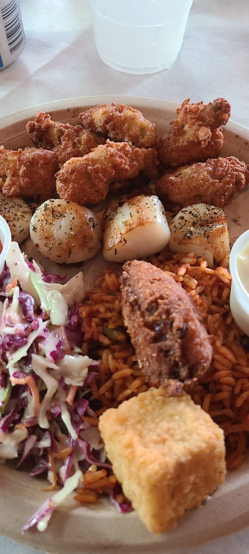 When the food came out we were both confused at first. The platter was a 10” paper plate with portion sizes literally half what they were two years ago, but about the same price. We spent $90 on a small paper plate and 3 very small sides of “MEHH” seafood fried by teenagers working part time, and sweated the whole time while we sipped a couple of tepid lagers. The rice was instant rice from a box, undercooked and crunchy. The little 3 ounce spoonful of beans that was a part of our “platter” was undercooked.