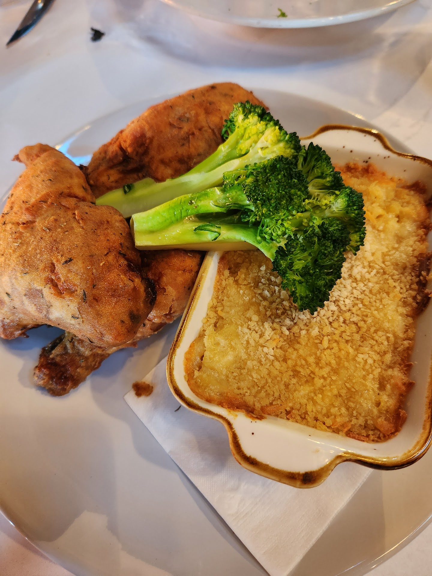 I had ordered the very simple fried chicken because the waitress said it was the best. I would not normally order such a plain thing, but she informed me that the chicken had been pre-cooked in a souls vida machine, so it was exceptional as it wasn’t Debri. It was exceptional! But the vegetables and macaroni and cheese that came with it were very bland and uninspired.