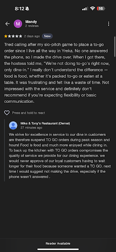 What’s the difference between me sitting down or taking my food to go? It’s the same food, same amount of time to make—yet somehow it was an issue.