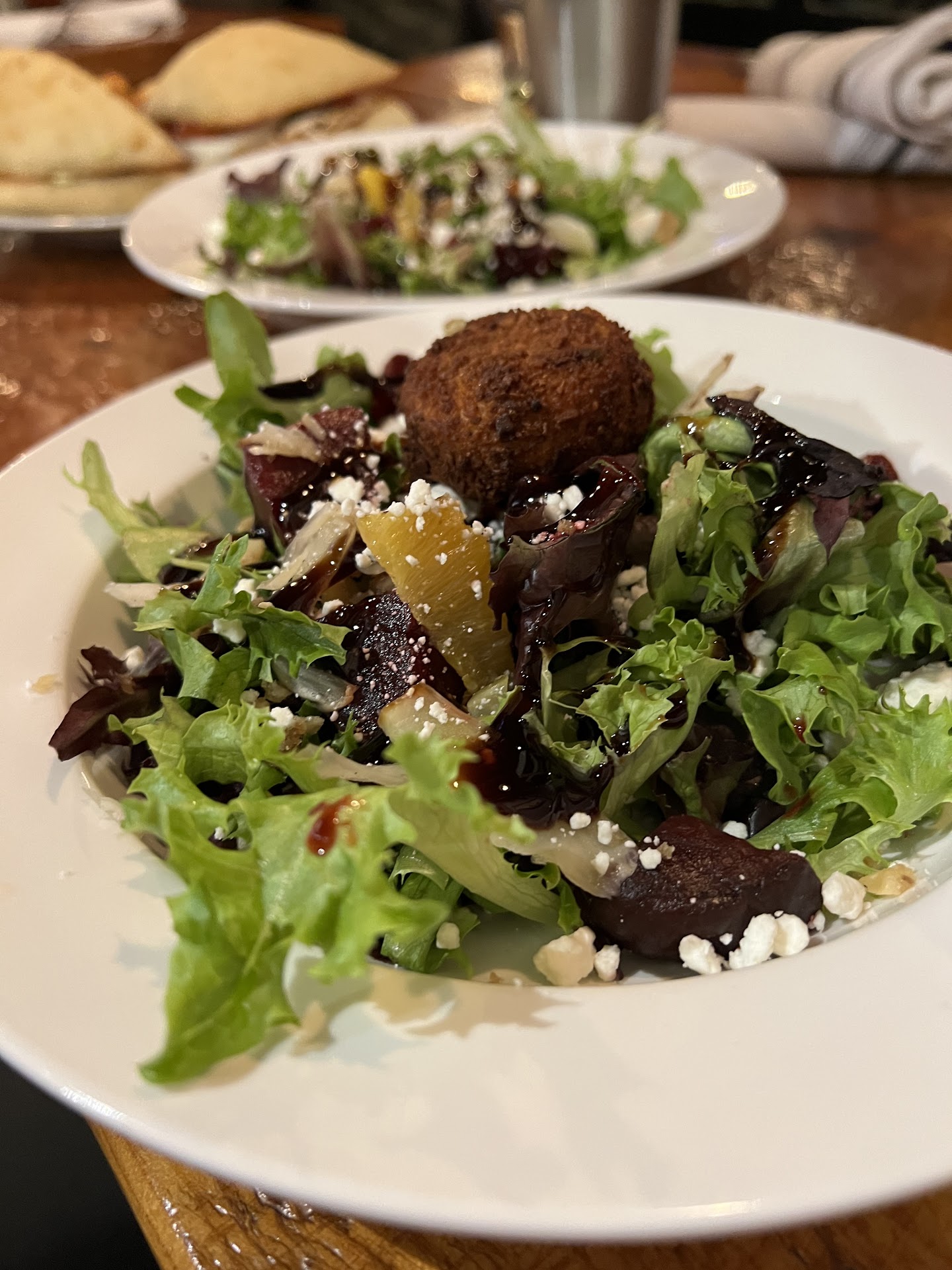 Shared a Beet Salad. Heads up, if you don’t like goat cheese they sprinkle it with goat cheese in addition to the deep fried goat cheese puck. Husband can’t stand goat cheese so he had to meticulously pick them off. Meanwhile, I just dug right in and ate it all. Beets and salad are all fantastic. They automatically split it into two bowls for us (all I said was “sharing a salad”) and no up charge. Much. Appreciated.
